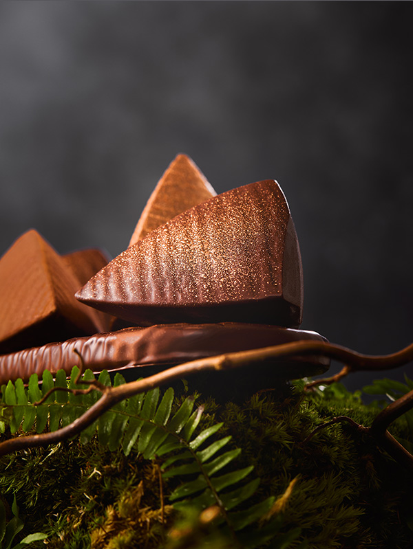 Entièrement recouvert de chocolat, le Joyau Noir semble tout droit sorti de terre. À l’intérieur, l’entremet dévoile une mousse au chocolat au lait et une ganache aux précieux éclats de truffe noire. Monochrome sculpté tout en majesté, le Joyau Noir présente en bouche une puissance hors du commun grâce à la présence de la truffe noire, adoucie par le chocolat au lait du Pérou 45% de chez Nicolas Berger, artisan en bean-to-bar.
