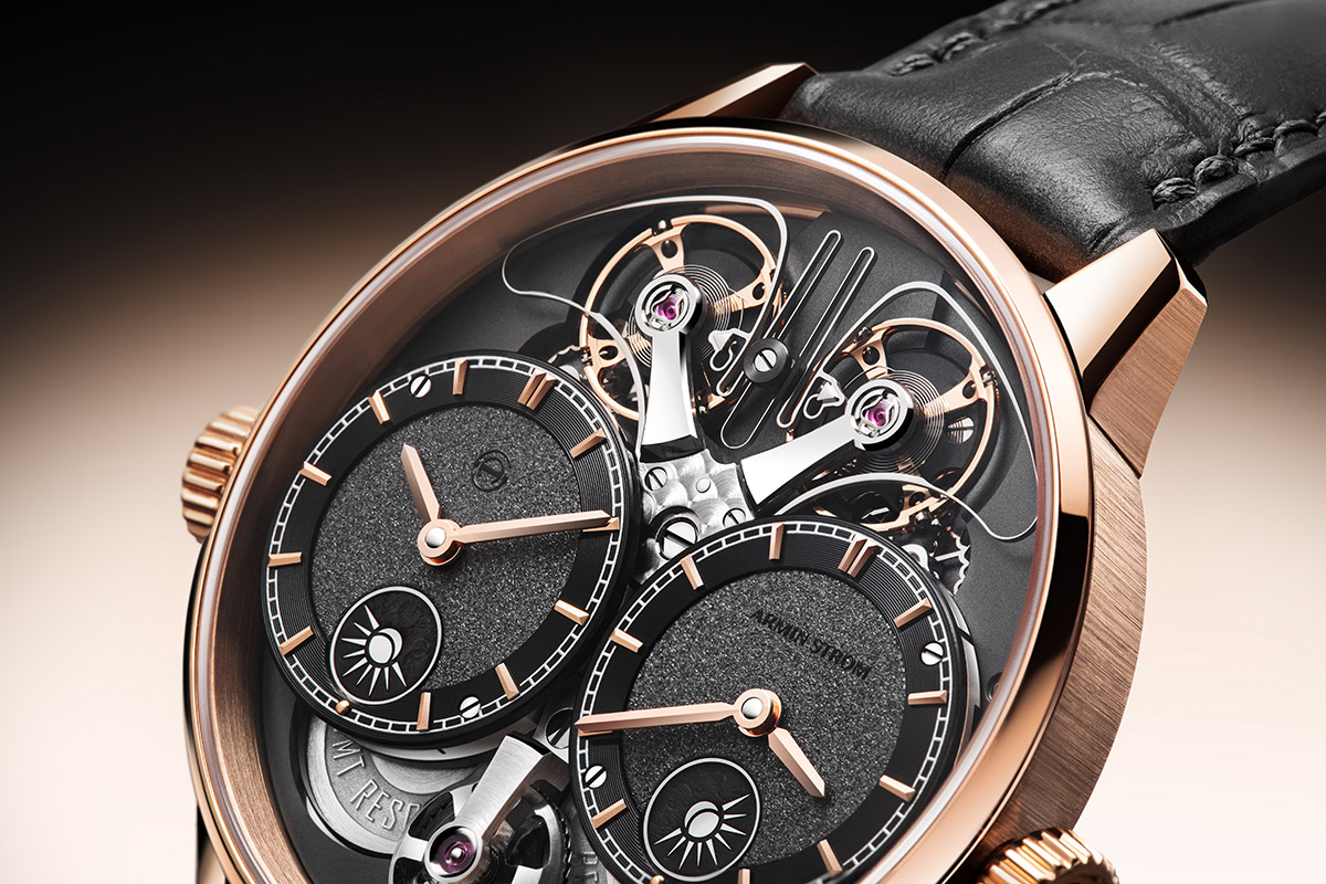L’anglage des ponts fait main, les éléments polis noir, le cerclage et le perlage enrichissent la construction du calibre, tandis que le fond laisse apparaître des Côtes de Genève. Comme toutes les montres Armin Strom, la Dual Time GMT Resonance Rose Gold est assemblée deux fois, garantissant précision mécanique et finition irréprochable.
