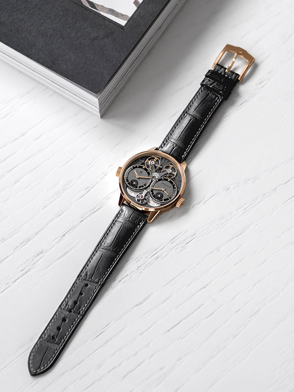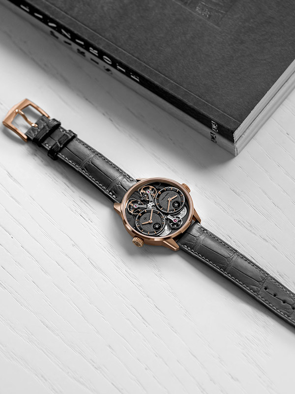 Dévoilé à travers des verres saphir côté cadran et côté fond, le mouvement révèle une architecture où finitions traditionnelles faites main et ingénierie mécanique s’expriment avec cohérence et précision. Côté cadran, les indicateurs jour/nuit gravés et polis miroir, représentant le soleil et la lune et positionnés à 6 heures de chaque cadran, apportent une dimension à la fois technique et poétique à l’ensemble.