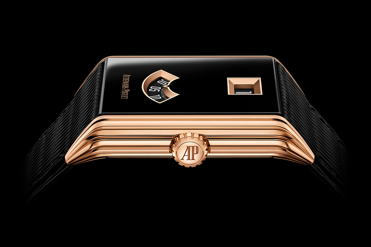 Arborant un design bicolore contemporain, ce garde-temps est équipé d’une glace en saphir dont la coloration noire est obtenue par traitement PVD. Deux guichets encadrés de pentes dorées et microbillées se découpent pour laisser défiler les chiffres des heures et des minutes en décalque blanche sur fond noir. La signature Audemars Piguet apparaît à 6 heures dans les tons or rose.