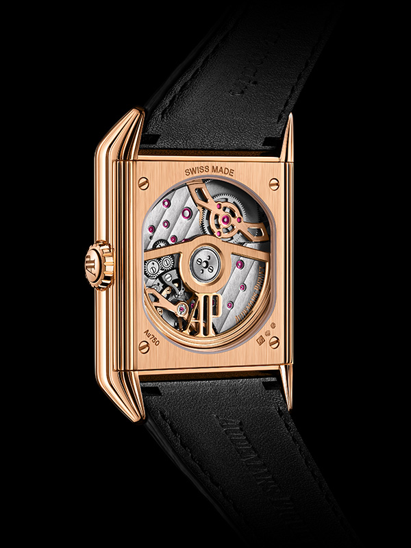 Avec un cadran mesurant 34,6 mm sur 34 mm, ce nouveau modèle reprend les codes esthétiques du pré-modèle 1271. La boîte rectangulaire conçue en or rose 18 carats est bordée de part et d’autre de huit godrons qui s’étirent en lignes élégantes et se terminent en point sur les cornes.