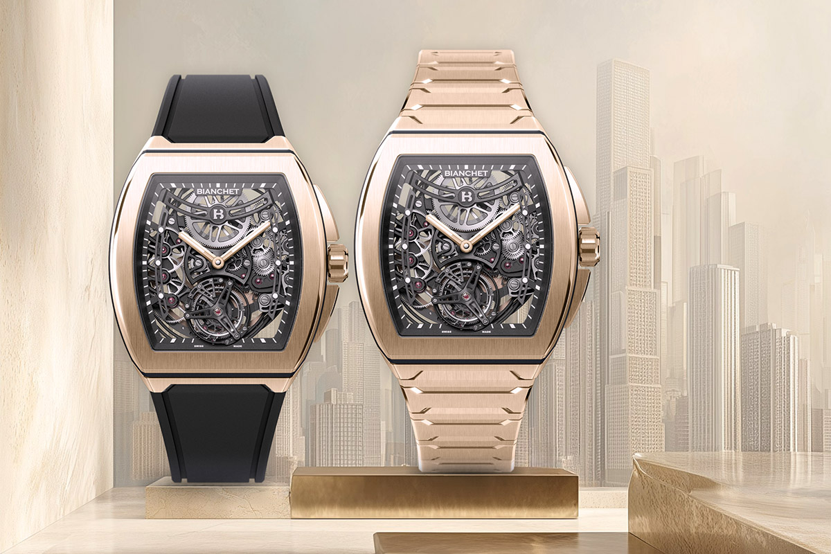 Réinventant le tourbillon tonneau ultra fin de Bianchet, cette nouveauté se décline en deux versions : la première avec un bracelet intégré en or, la seconde avec un bracelet en caoutchouc noir et boucle ardillon en or. Cette dernière offre une allure plus sportive mais toujours raffinée.