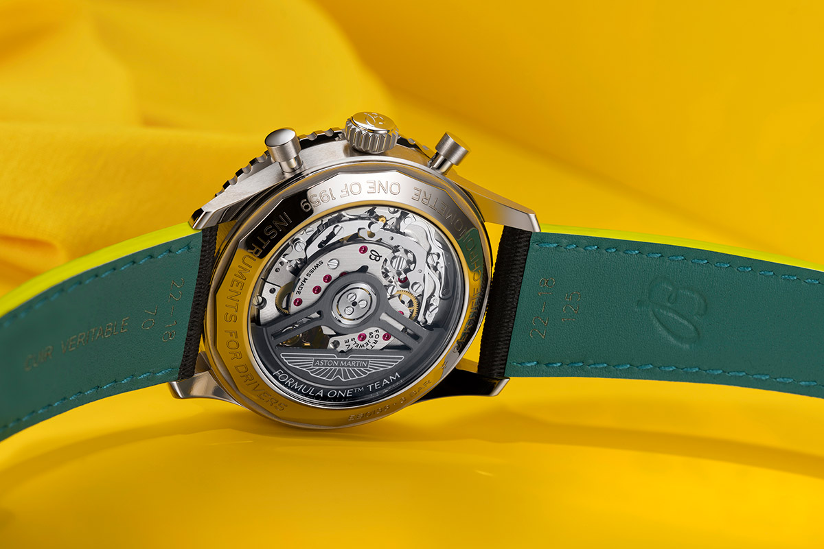 Son rotor noir mat, développé spécialement pour cette édition, est en tungstène recouvert d’un revêtement PVD haute durabilité. Il arbore le logo Aston Martin Formula One Team. On peut aussi lire, gravés sur le fond du boîtier, les mots « One of 1959 » et « Instruments for Drivers ».