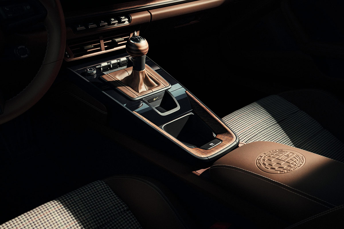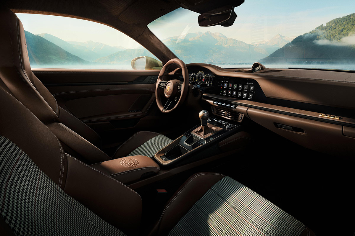 Dans l’habitacle, les parties centrales des sièges en tissu F. A. Grid-Weave complètent le revêtement en cuir Club Brun Truffe. Une ambiance particulière réalisée en mémoire de F. A. Porsche. Ce tissu inspiré d’un motif de veste se retrouve également dans la boîte à gants, sur le porte-document et sur le tapis réversible dans le coffre à bagages.