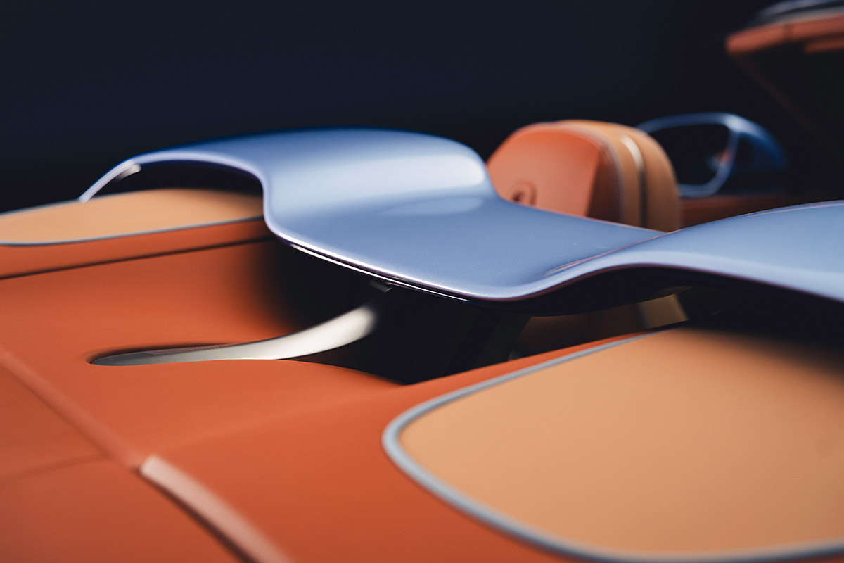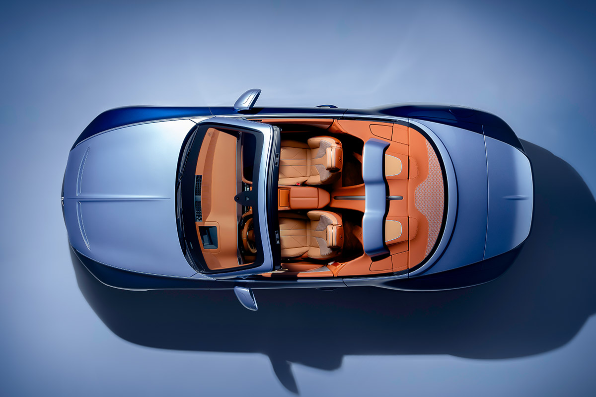 Ce cabriolet arbore une esthétique luxueuse, avec une livrée tricolore personnalisée, ornée d’un fin liseré argent brillant de 6 mm soulignant le design du capot. La teinte « Bleu Breslow » de la partie supérieure est assortie à la toile de toit, offrant ainsi une première : un toit sur mesure qui, une fois replié, dévoile l’Airbridge assorti.
