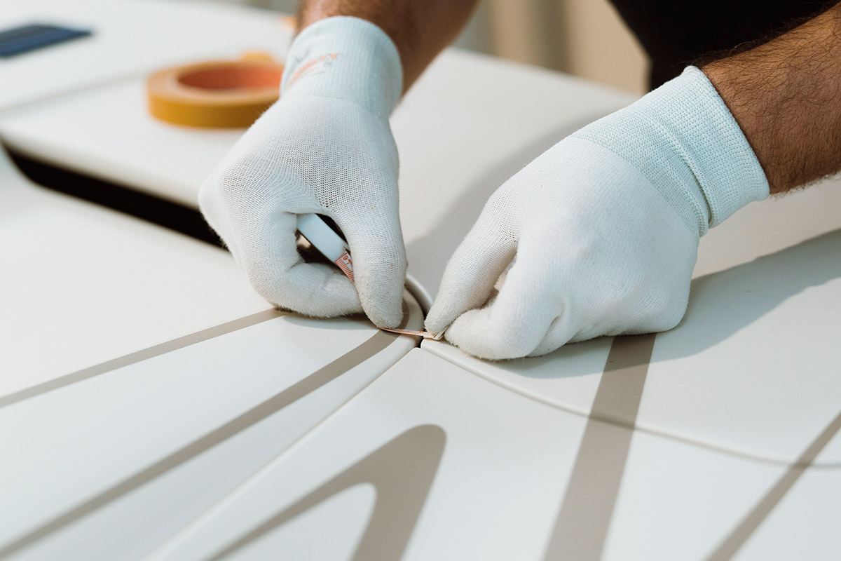 Au cœur de l’identité du véhicule, les lignes caractéristiques blanches et dorées ont été réalisées à l’aide d’un processus exceptionnellement complexe. Du masquage et du traçage minutieusement effectués à la main jusqu’à l’application méticuleuse de la peinture sur l’ensemble de la carrosserie, des centaines d’heures et un savoir-faire exceptionnel ont été consacrés à la concrétisation de cette vision.