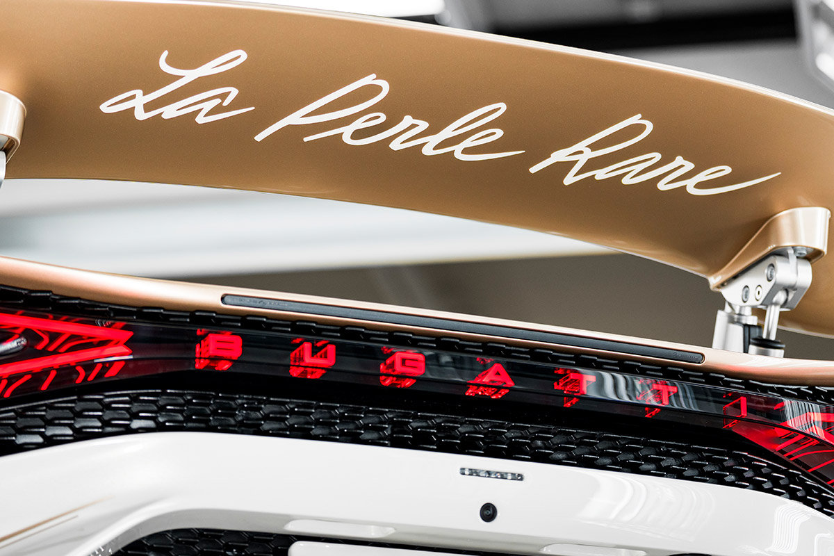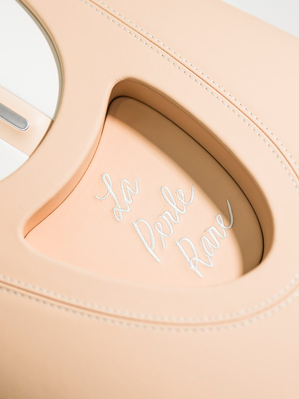 Pour parfaire cette fusion harmonieuse entre extérieur et intérieur, il fallait une touche artistique aussi unique que personnelle. La signature « La Perle Rare », unique à ce véhicule et écrite de la main même de Jascha Straub, orne ainsi le roadster sous différentes formes : de la broderie le long du tunnel central, aux gravures sur le capot moteur blanc et or sur mesure, jusqu’à la signature peinte sous l’aileron arrière.