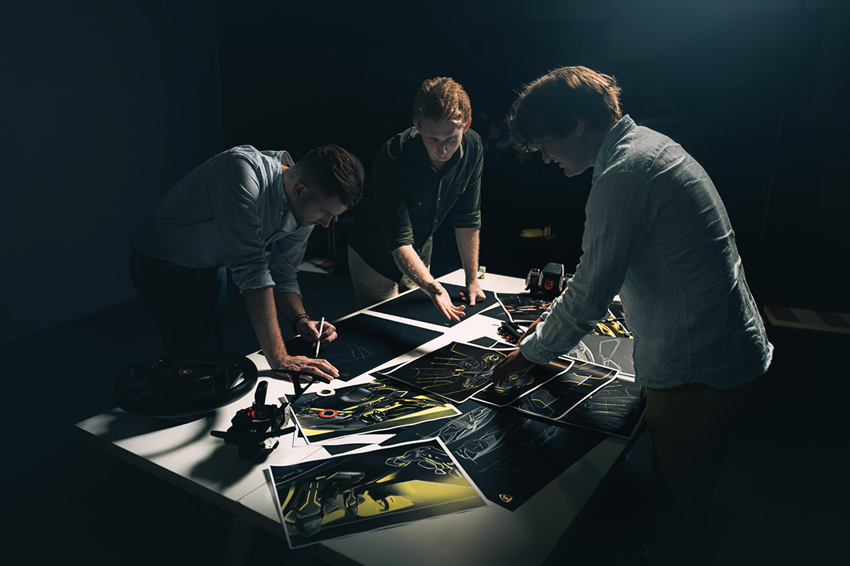 Même si la curiosité est la qualité essentielle de tout designer Lamborghini, certains éléments sont incontournables. La silhouette est primordiale. Une Lamborghini vue de profil doit être reconnaissable au premier coup d’œil. La signature graphique en « Y » et les motifs hexagonaux sont tout aussi essentiels car il relient le design des automobiles de la marque à ses racines, le design industriel italiens des années 60.