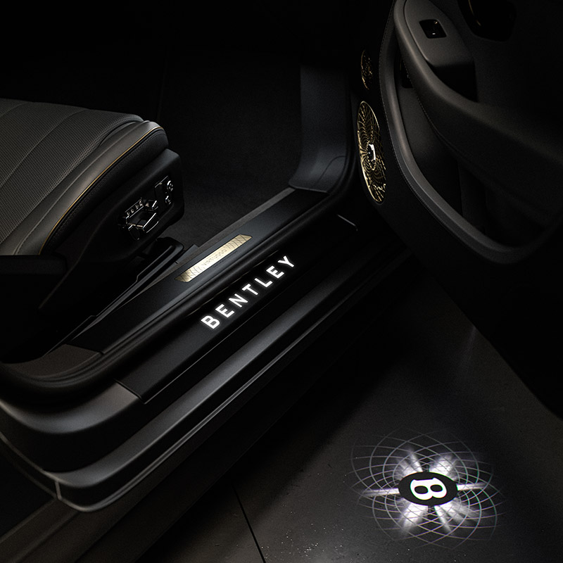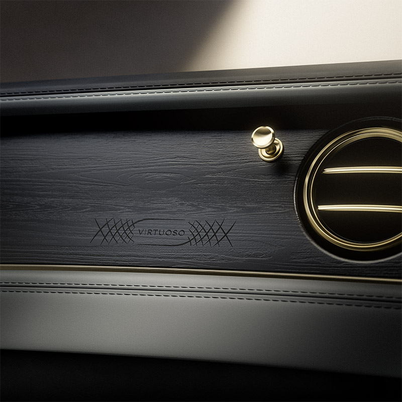 Les finitions Champagne Gold de la collection Virtuoso se retrouvent à l’extérieur comme à l’intérieur : emblèmes ailés Bentley, sorties d’échappement, badges de collection… À l’intérieur, une animation de bienvenue Virtuoso exclusive vous accueille. Les seuils de porte reprennent le style des grilles de haut-parleurs spécifiques situées à l’avant des portières.