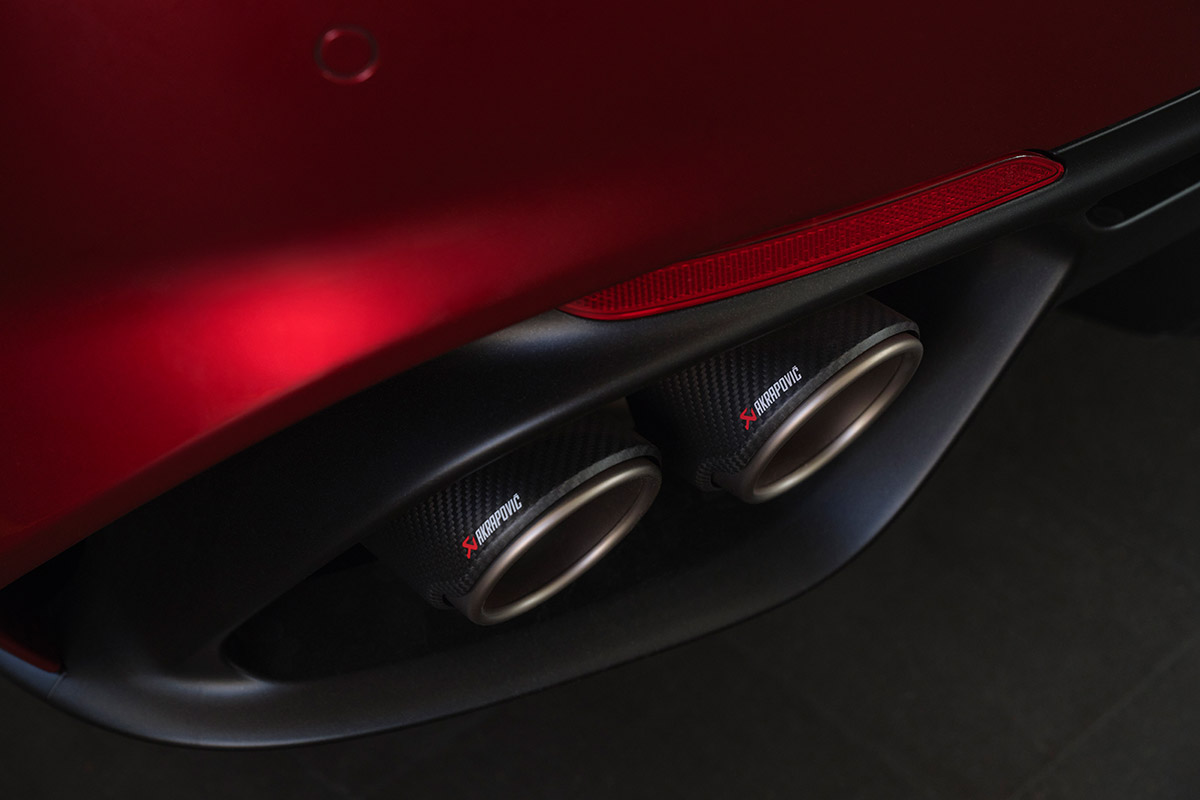 L’aérodynamique active de la Giulia est également assurée par le splitter avant en fibre de carbone. Une fois activé, il contrôle la qualité du flux d’air sous le véhicule pour augmenter la stabilité et les performances. Enfin, le système d’échappement Akrapovič émet un son incomparable traduisant l’esprit sportif du moteur.