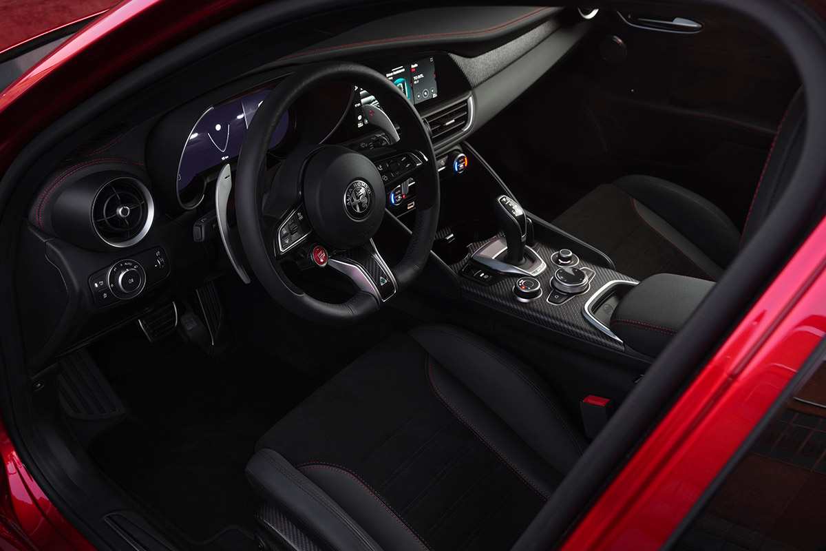 La Giulia Quadrifoglio offre une expérience typiquement Alfa Romeo, où chaque choix de conception vise l’équilibre absolu entre légèreté, rigidité et répartition optimale du poids. Pour ce faire, on retrouve l’utilisation de matériaux ultralégers tels que l’aluminium pour le moteur et la fibre de carbone pour l’arbre de transmission, le capot, le spoiler, les jupes latérales, la planche de bord et les panneaux.