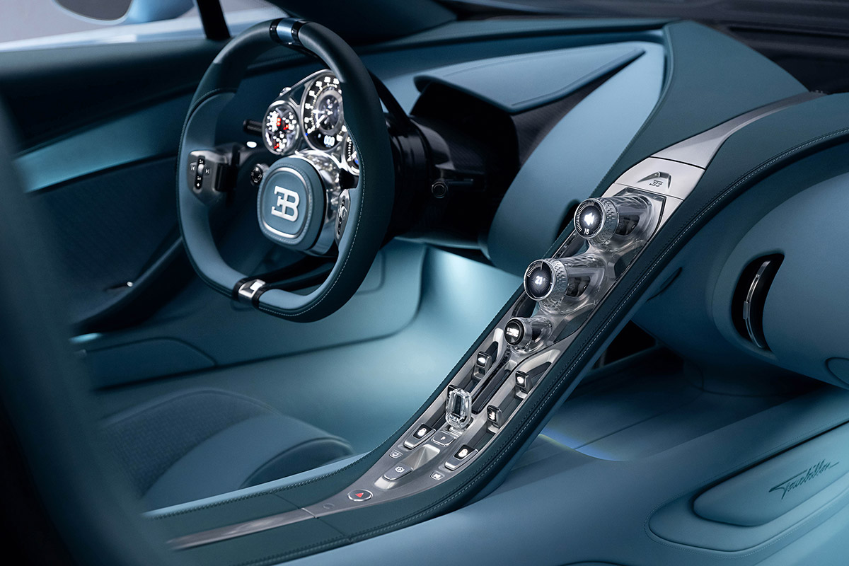 Des tissus inédits, spécialement développés et sur mesure pour les sièges et les panneaux de porte, s’associent à des cuirs souples pour éveiller les sens des occupants. Bugatti adopte une approche baptisée « car couture », qui transpose l’univers de la Haute Couture dans celui de l’automobile.