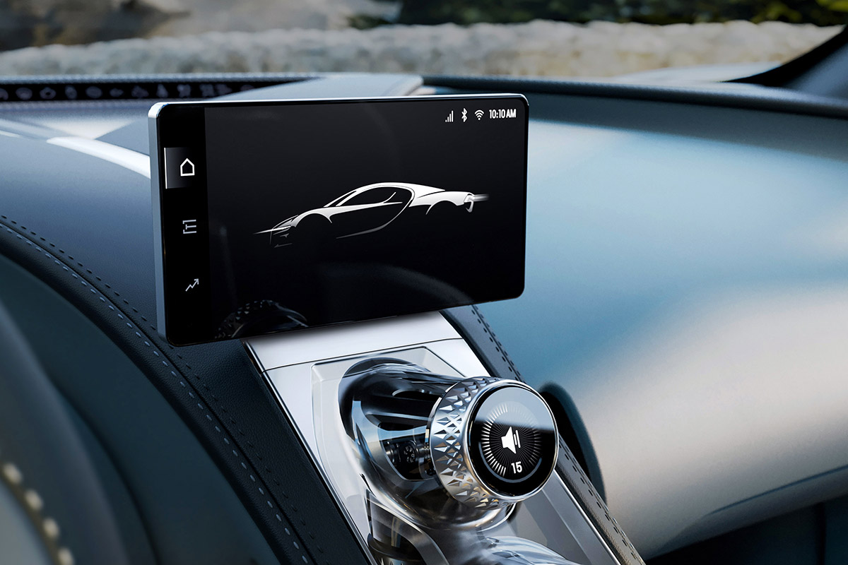 Ici, l’équipe de design a opté pour une interface homme-machine délibérément analogique. L’accent a été mis sur des commandes physiques, conçues pour offrir une qualité exceptionnelle en terme de toucher, de résistance et de course, tandis que l’écran central reste dissimulé dans le tableau de bord jusqu’à ce qu’il soit déployé sur demande.