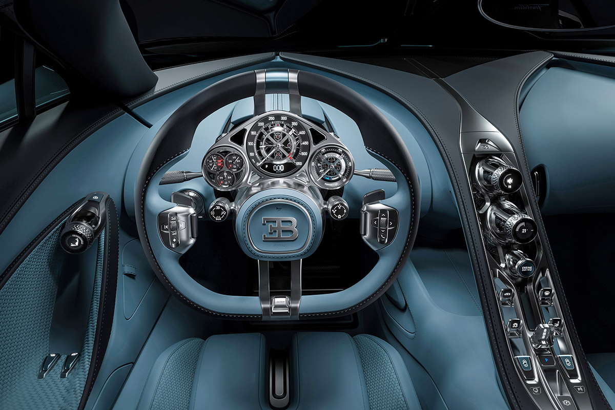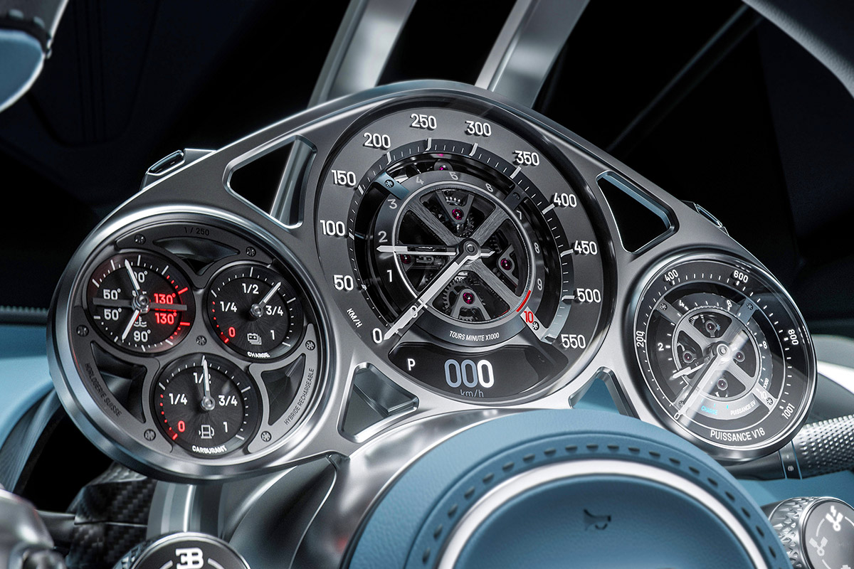 Adoptant la même approche que pour le volant, les cadrans offrent à voir toute la beauté de la mécanique. Leur boîtier en aluminium fraisé, leur design ajouré et l’utilisation du cristal rappellent la simplicité mécanique raffinée des modèles Bugatti du début du XXe siècle.