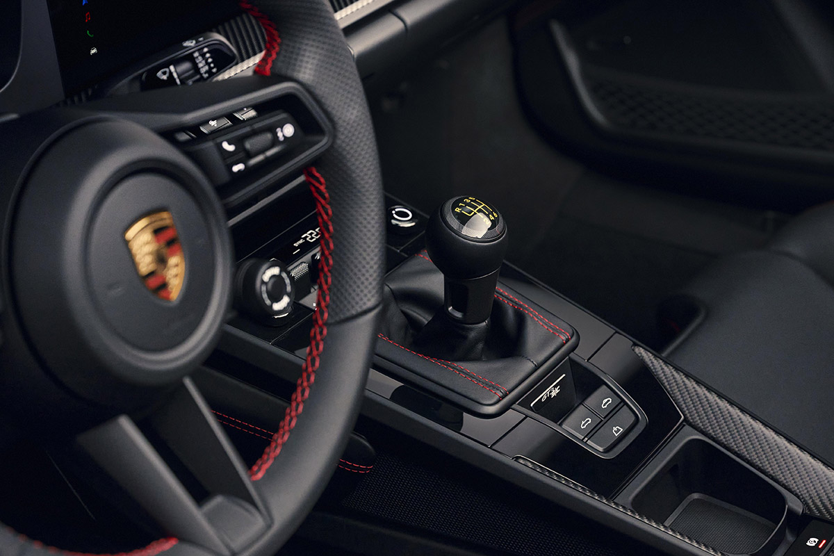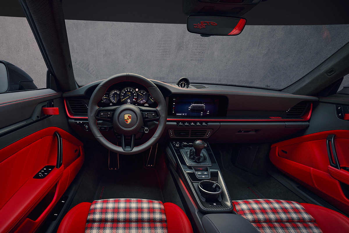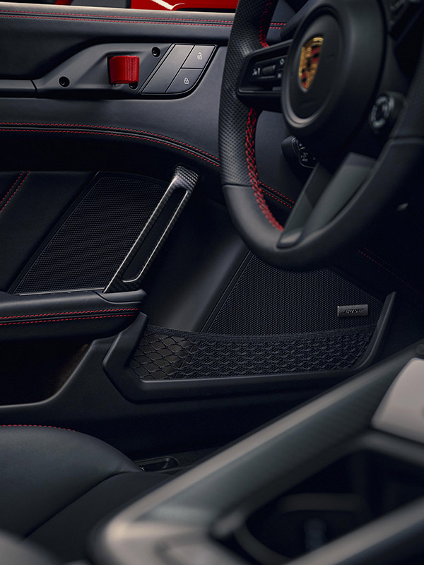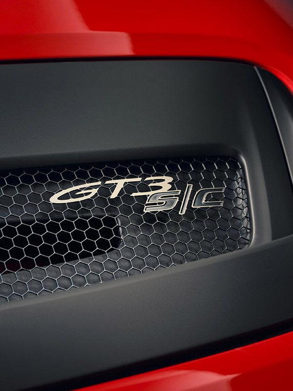 La logique d’allégement se poursuit dans l’habitacle. On y retrouve des moquettes légères et des panneaux de porte allégés empruntés à la 911 S/T, dotés d’une poignet en fibre de carbone. D’autre part, la 911 GT3 S/C est une pure biplace. L’habitacle est revêtu de cuir Noir de série, y compris les pare-soleil et les garnitures des montants A. Le logo GT3 S/C est brodé au centre de la plage arrière.