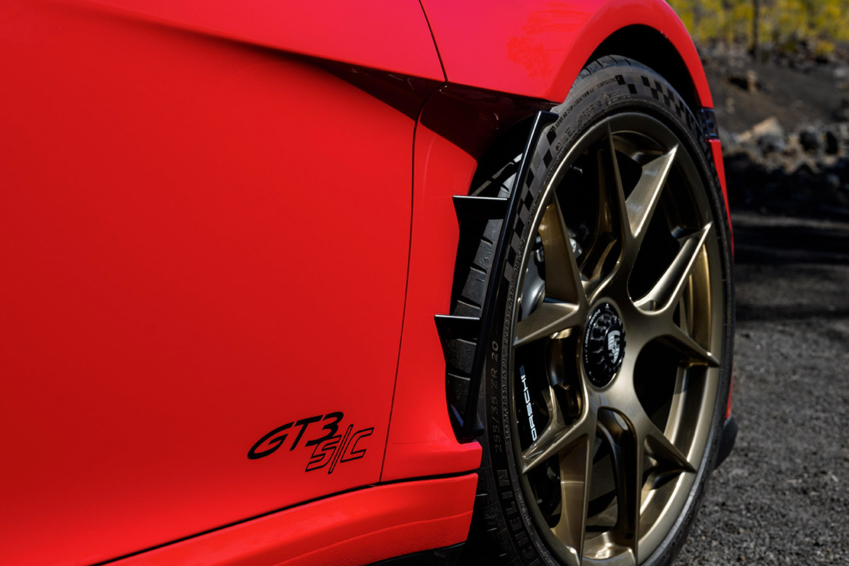 Côté châssis, la combinaison de matériaux légers, comme la fibre de carbone pour le capot, les ailes et les portes, garantit à cette 911 une agilité remarquable. Les barres antis-roulis et le renfort de soubassement sont repris de la 911 S/T. Les jantes à verrouillage central de 20 pouces à l’avant et 21 pouces à l’arrière sont fabriquées en magnésium, offrant un gain de poids de 9 kg.