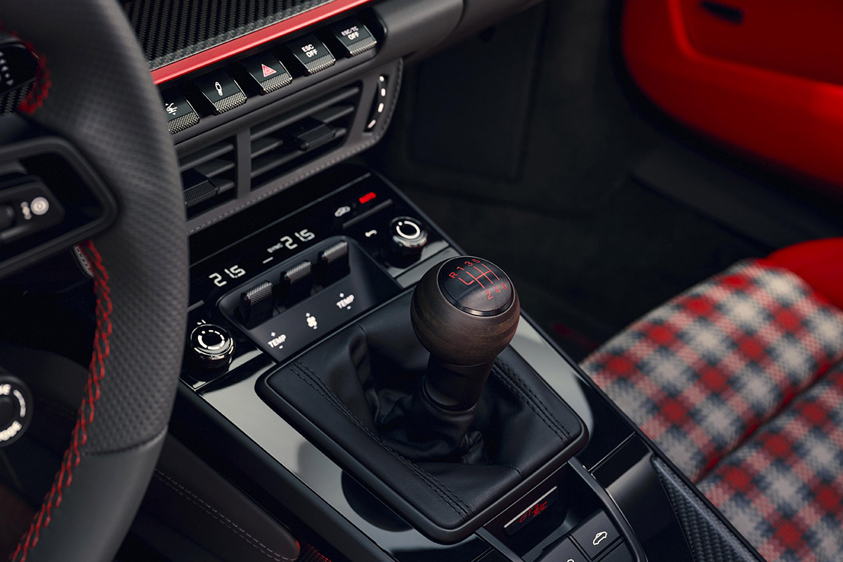 Dans le coffre avant, un tapis réversible allie fonctionnalité et style avec une moquette Gris Ardoise d’un côté et Rouge Indien de l’autre. Les pare-soleil, la coque du rétroviseur intérieur et le cadre du pare-brise sont revêtus de Race-Tex perforé en Gris Ardoise. Le levier de vitesses teinté, doté d’un pommeau en bois lamellé et arborant le schéma de passage des rapports en Rouge Pyro, est également un élément distinctif.