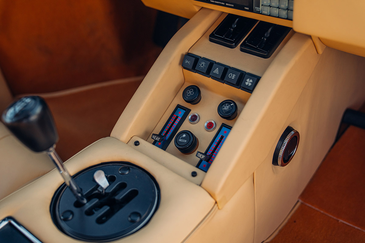 Bien que trois Countach, toutes versions confondues, aient été peintes en Oro Sahara, l’exemplaire présenté ici, châssis numéro DLA12559, est la seule Lamborghini Countach 5000 S à arborer cette teinte particulière. Dotée d’un intérieur en cuir Champagne, cette voiture fut achevée par Lamborghini en février 1983, destination l’Arabie saoudite.