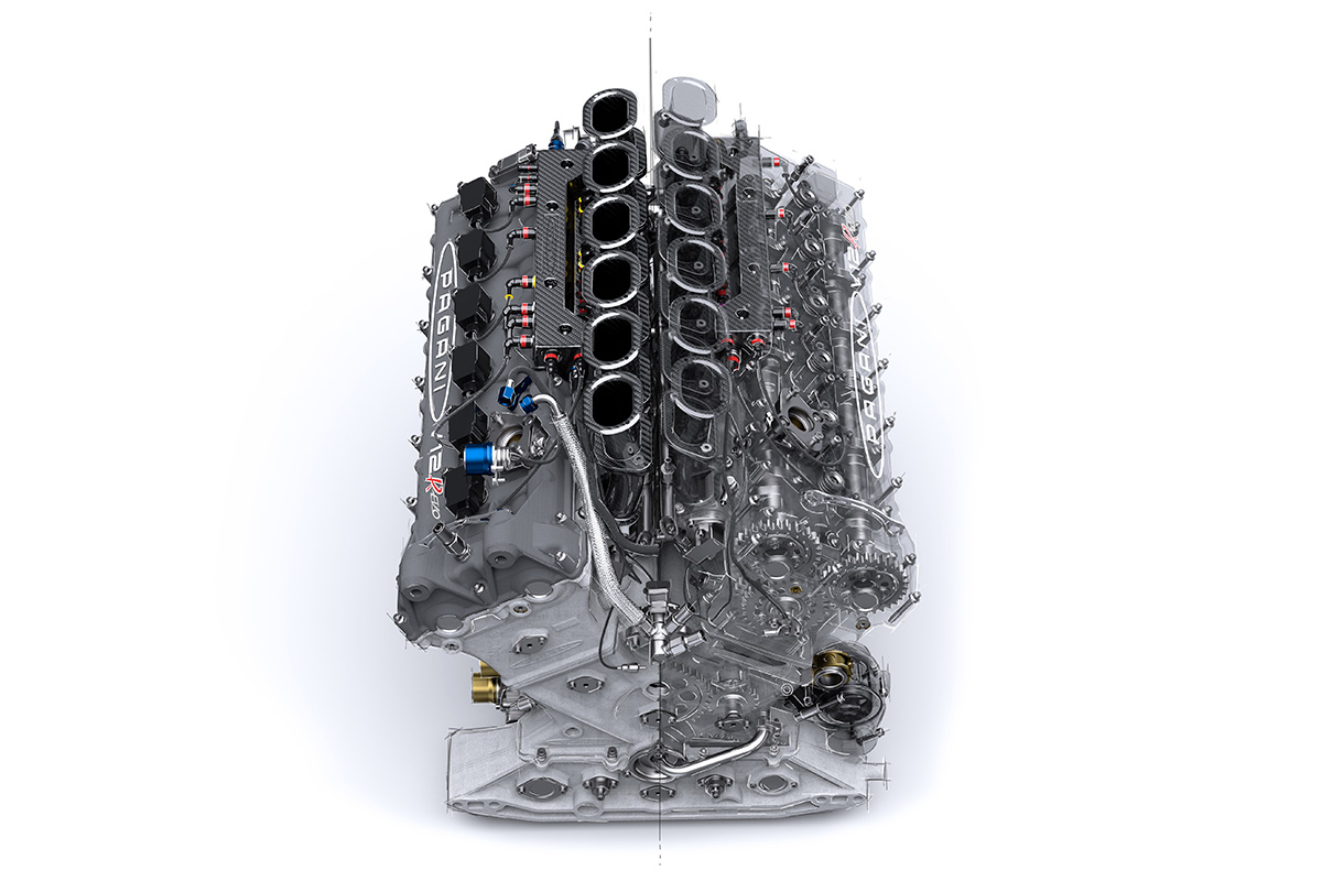 Le moteur a été optimisé avec notamment de nouveaux arbres à cames et un travail sur l’admission et l’échappement. Il délivre 900 chevaux avec un couple maxi de 770 Nm. Il est accouplé à une boîte de vitesse séquentielle à six rapports à crabots, via un embrayage à triple disques en métal frité. Ainsi équipée, la Huayra R Evo atteint les 350 km/h.