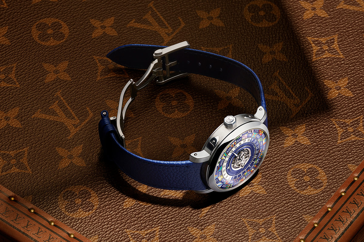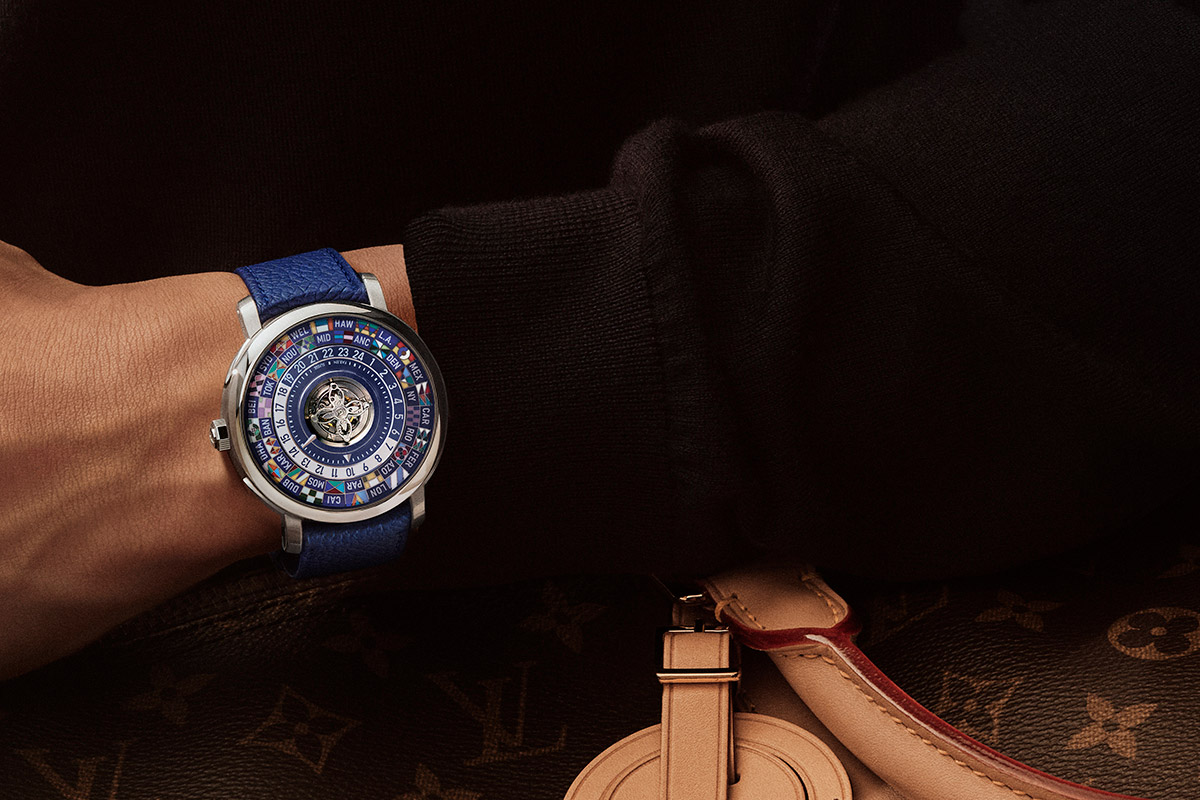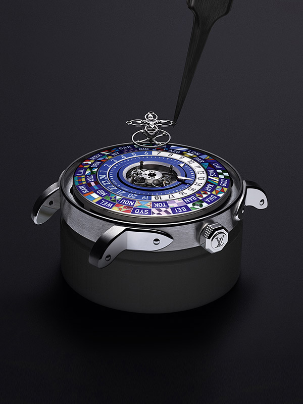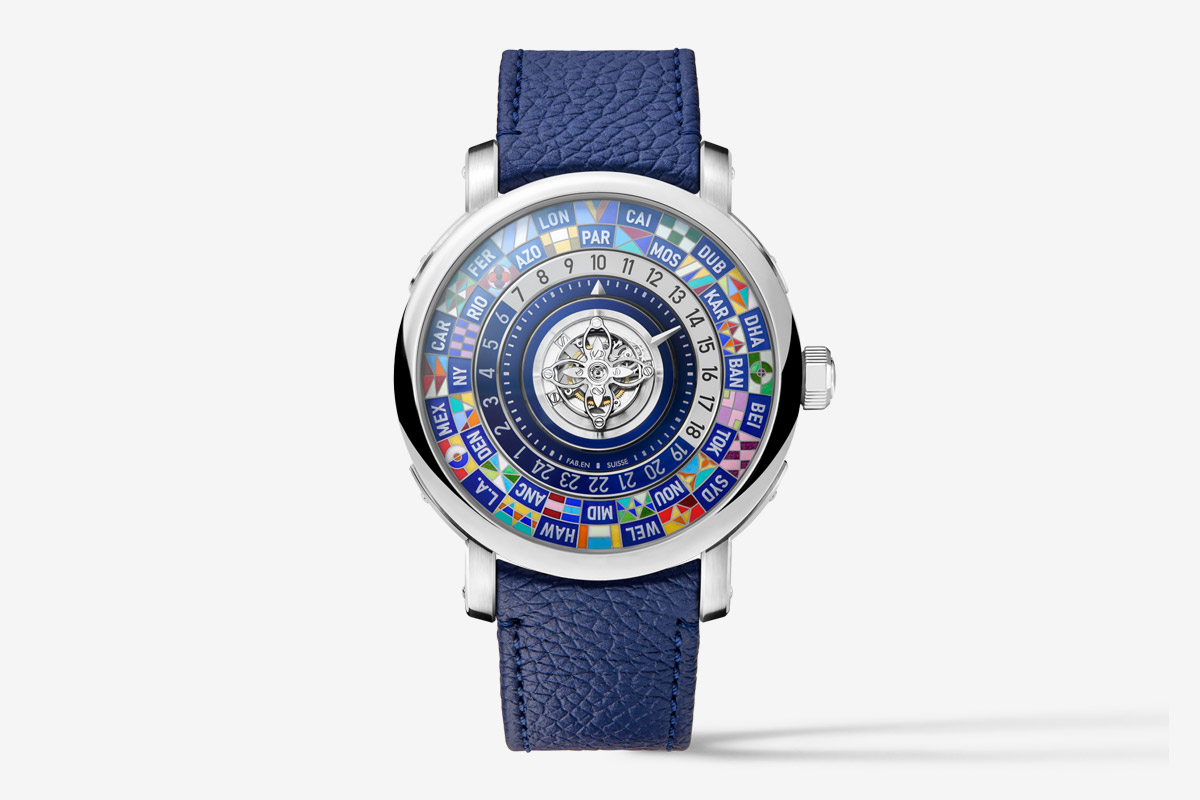 Le premier réinterprète l’icône avec un disque des heures universelles décoré par technique de peinture miniature. Son cadran central bleu est épuré pour une meilleure lisibilité, avec une texture grainée qui rend hommage à celle de la toile Monogram historique. Le second modèle, Escale Worldtime Tourbillon, reprend la même composition tout en élevant encore le savoir-faire utilisé. Les drapeaux sont ici réalisés en émail grand feu et un tourbillon volant central crée du mouvement au cœur du cadran.