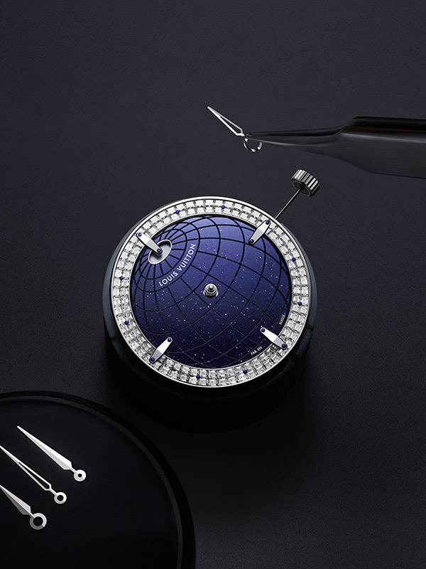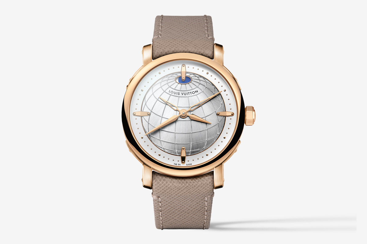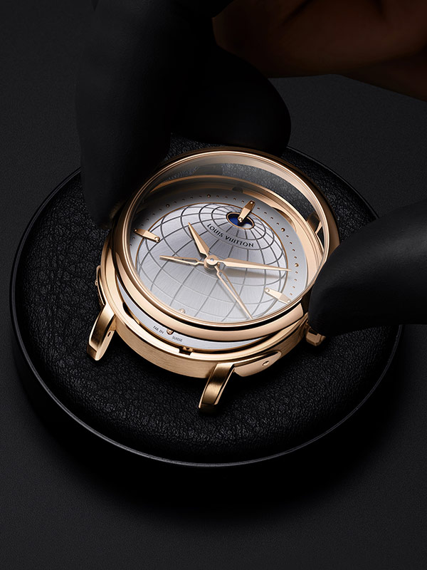Le globe argenté du cadran de la version en or rose est gravé de méridiens et de parallèles fins et polis. Sa finition satinée soleillée capte et reflète la lumière animant la cartographie du globe à chaque mouvement du poignet. Entourée d’un délicat réhaut opalin, la minuterie est ponctuée de clous dorés rappelant ceux utilisés pour fixer la lozine sur l’extérieur des malles Louis Vuitton.