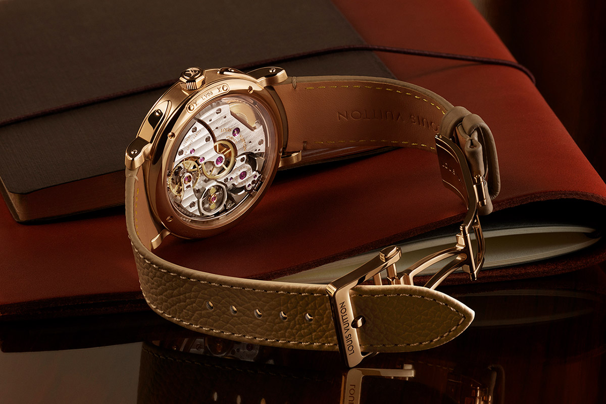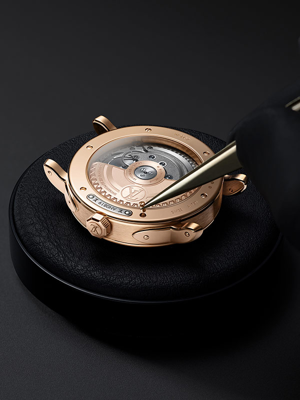 Le boîtier Escale accueille le calibre LFT SO 13.01, un mouvement à remontage manuel issu de l’héritage horloger commun de La Fabrique du Temps Louis Vuitton et de Gérald Genta. L’association d’une répétition minutes et de l’heure sautante est une prouesse rare en horlogerie moderne. En effet, la synchronisation de deux systèmes horaires indépendants, l’un dédié au mécanisme de sonnerie, l’autre à l’affichage de l’heure sautante, de manière fiable et économe en énergie représente un vrai défi.