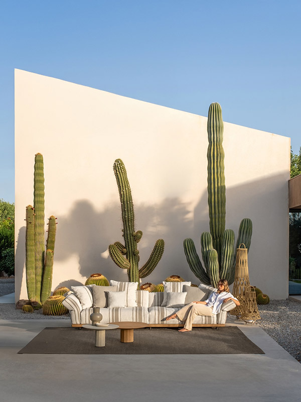 La collection se distingue par sa structure en Accoya, un bois d’une résistance et d’une durabilité exceptionnelles, et par ses coussins déclinés dans une palette allant des tons neutres aux couleurs vibrantes comme l’ocre et le bleu. Pour compléter l’offre, des tables basses avec plateaux en verre laqué introduisent un nouveau matériau dans l’univers Talenti.