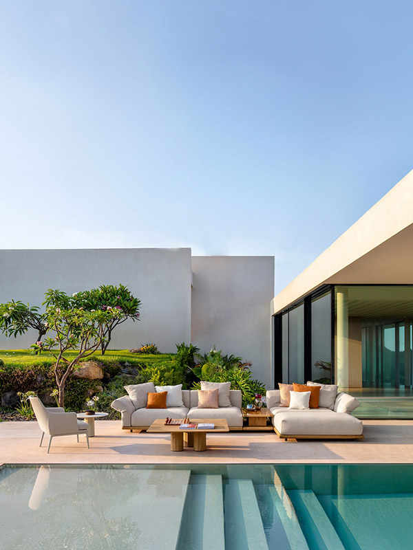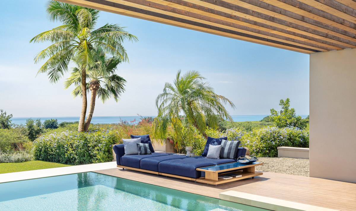 Cette solution technique, parfaitement intégrée à l’esthétique, confère au canapé une sinuosité dynamique, ouvrant de nouvelles perspectives d’aménagement pour profiter pleinement de l’espace extérieur.