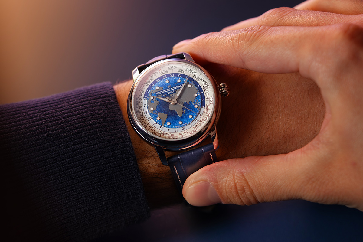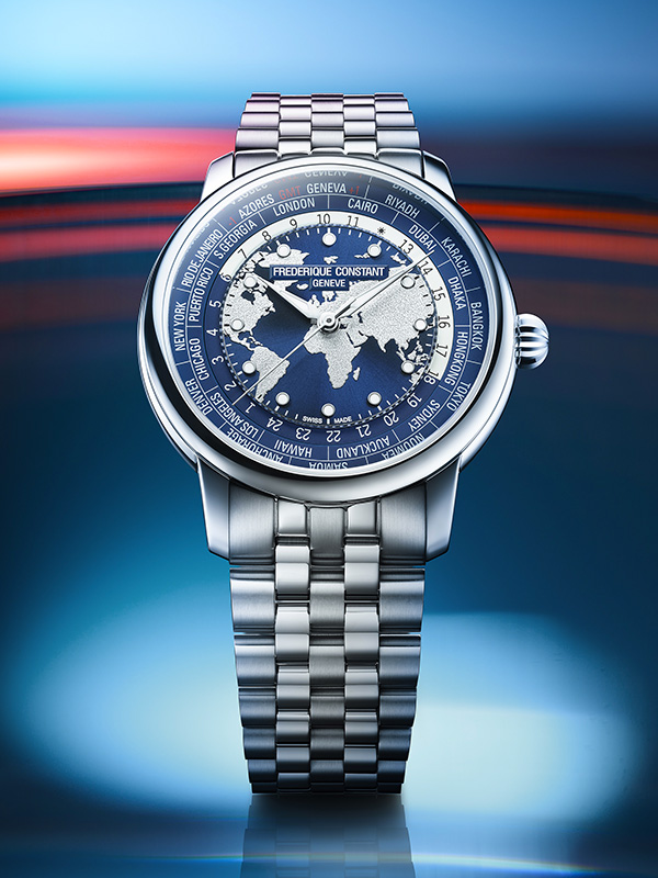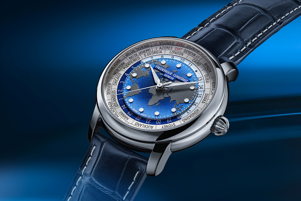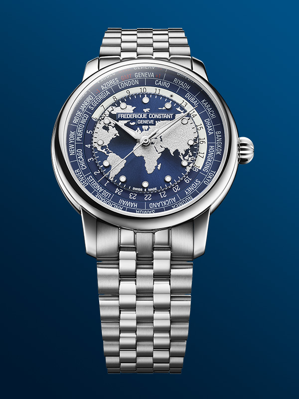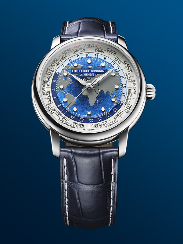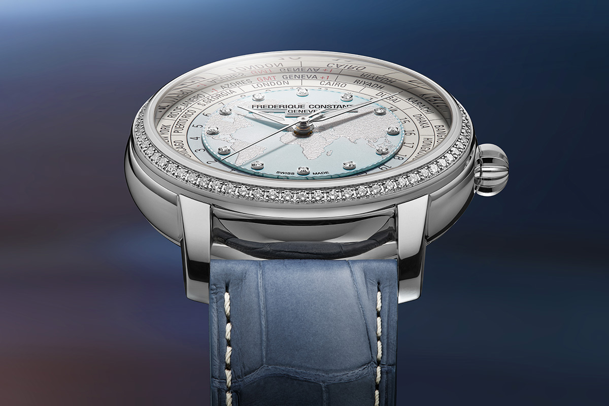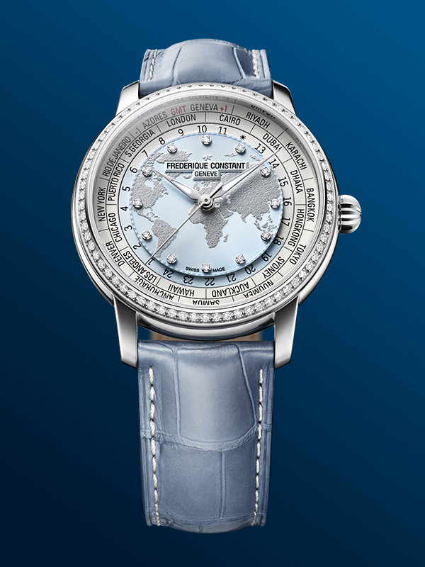 Le boîtier aux dimensions repensées, 40 mm, est aussi l’occasion de proposer une version sertie de 70 diamants sur la lunette et de 12 indexes sertis de diamants sur le cadran. Une série limitée et gravée individuellement à seulement 88 exemplaires, comme 1988, date de création de Frédérique Constant. Son cadran inédit figure un océan bleu clair soleillé et des continents en relief, grainé gris.