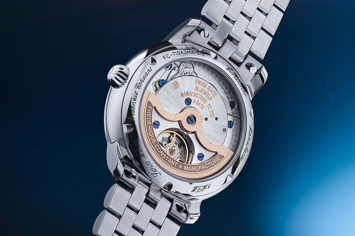 À travers le fond saphir, on peut admirer l’attachement de Frédérique Constant aux finitions : le bâti automatique arbore des Côtes de Genève soleillées. Ponts et barillets, de rouages et de balancier sont eux perlés tandis que la masse oscillante est satinée et colimaçonnée.
