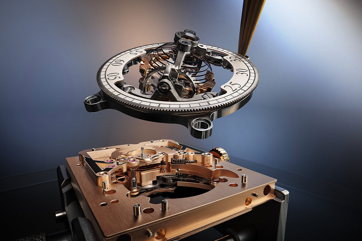 Il se compose d’une cage intérieure ultra-légère en titane et d’une autre périphérique montée sur roulements à billes qui tournent perpendiculairement l’une à l’autre à des vitesses différentes : la première effectue une rotation de 360 degrés toutes les 16 secondes tandis que la seconde tourne une fois par minute.