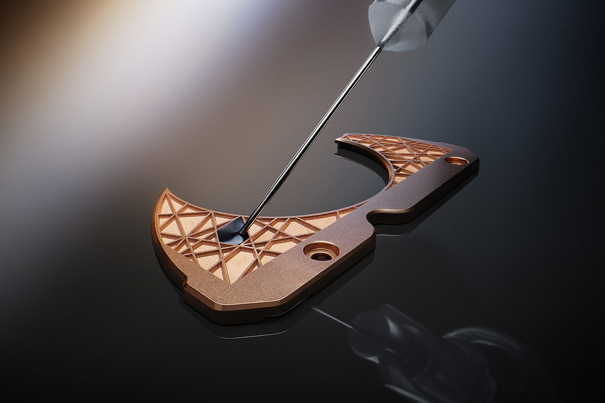 Au verso, la laque noire rehausse l’élégance aérienne de l’anneau squeletté des heures-minutes et des ponts qui le soutiennent, contrastant avec les tons chauds des divers composants du mouvement et la texture douce des éléments microbillés.