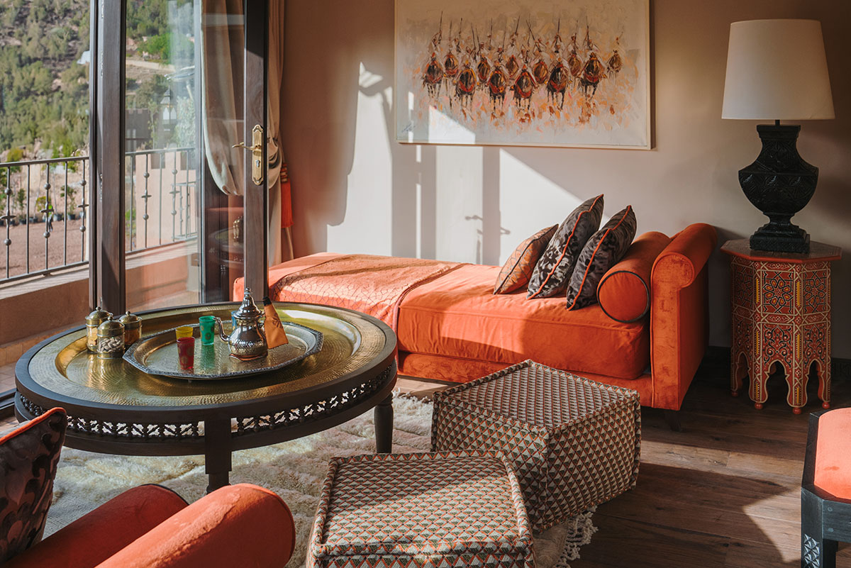 La décoration est en harmonie avec la tranquillité de son environnement et célèbre l’artisanat ancestral de la région, tout en étant traversée par de multiples inspirations venues du monde entier. Le précédent propriétaire était le célèbre antiquaire Luciano Tempo. Lorsque Sir Richard Branson a acheté la propriété, il a également hérité de la collection de Luciano. Ses œuvres d’art et antiquités décorent encore aujourd’hui la Kasbah.