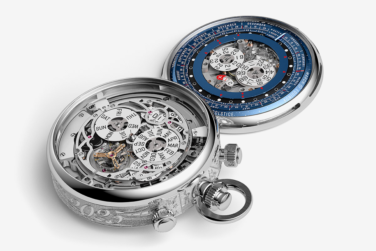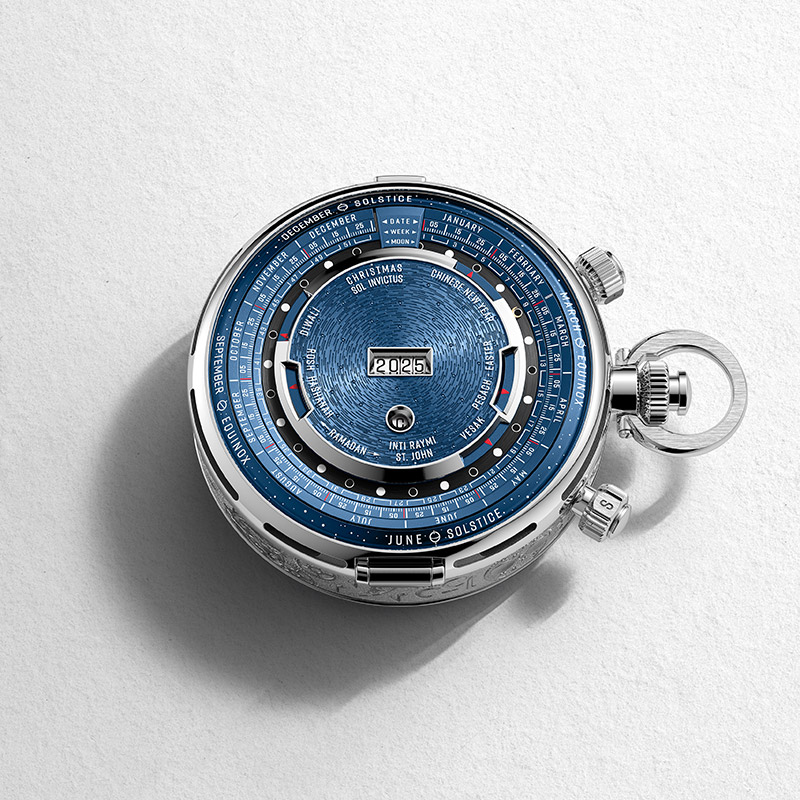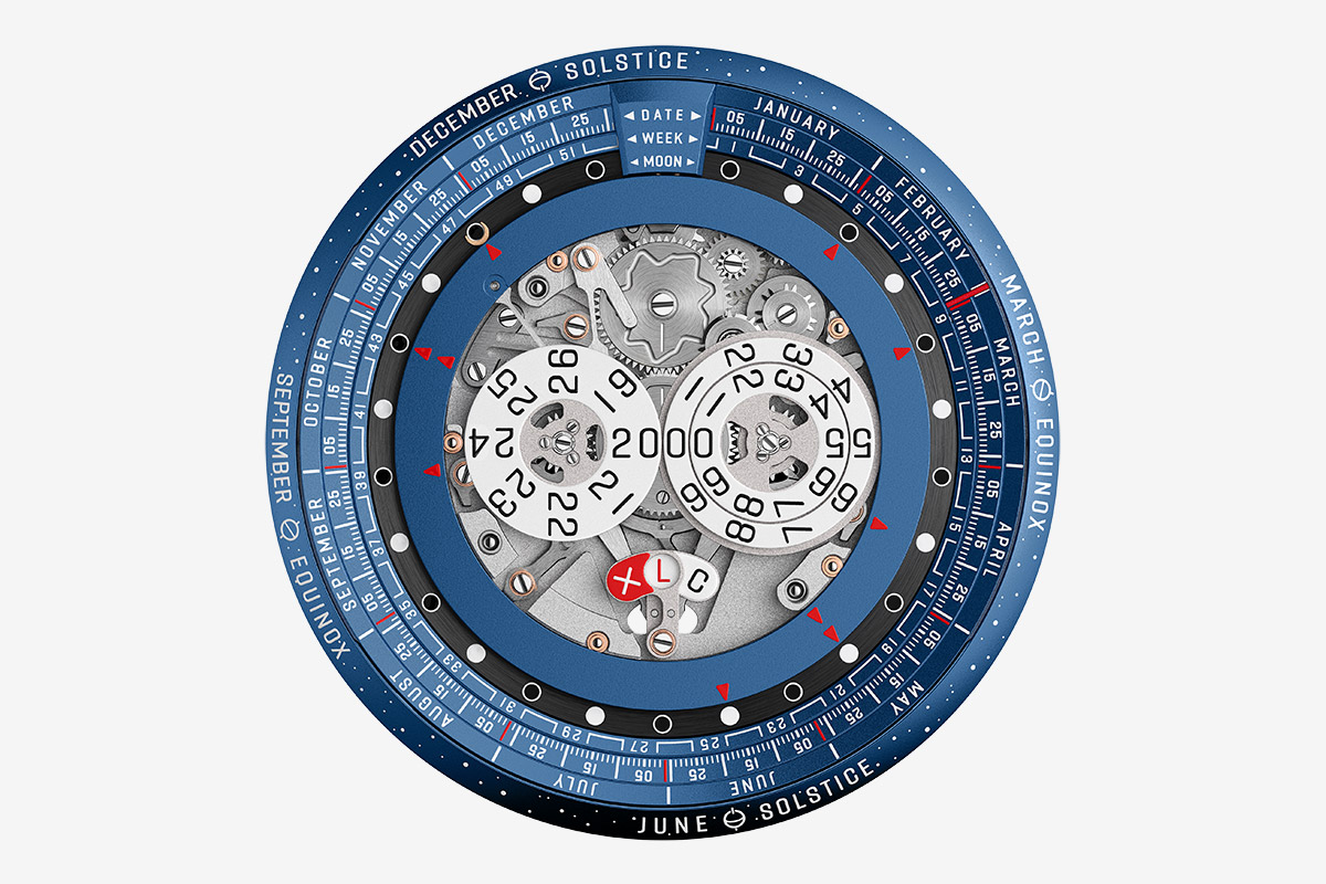 Prenant le calendrier grégorien pour référence, le Calendrier Universel réunit 8 complications qui associent les cycles solaire, lunaire et lunisolaire sur un seul cadran, offrant un panorama à 360° comptant 18 indications : les années, les années bissextiles, les mois, les dates, les semaines, les phases de Lune et les marqueurs saisonniers tels que les solstices et les équinoxes, ainsi que neuf célébrations culturelles issues de traditions mondiales. Parmi celles-ci, certaines sont basées sur le Soleil : Noël et la Saint-Jean, d’autres sur la Lune : le début du Ramadan et d’autres encore sont lunisolaires, comme Diwali, Roch Hachana, Pessa’h, Vesak, Pâques et le Nouvel An chinois.