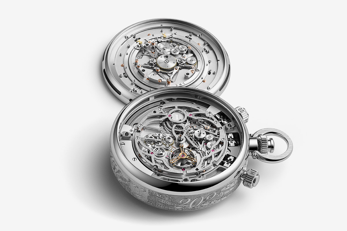 Le Calibre 1150 a été adapté à un format de remontage manuel, dépourvu de masse oscillante. Réunissant les savoir-faire de la Manufacture en un seul mouvement de 1 099 composants, cette prouesse de Haute Horlogerie offre à elle seule 40 fonctions dont 22 complications, parmi lesquelles une Grande Sonnerie, une répétition minutes, un calendrier perpétuel semi-grégorien, un chronographe flyback à rattrapante et un tourbillon volant.