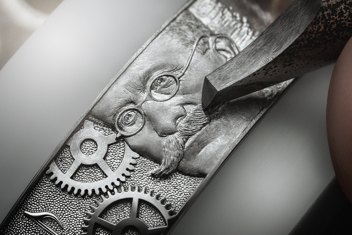 Audemars Piguet s’est appuyé sur l’expertise de nombreux artisans chevronnés pour la décoration de la 150 Heriatge. Le boîtier en platine est entièrement gravé à la main. En regroupant tous les poussoirs et les couronnes du chronographe sur une zone du flanc, le reste de la surface sert de canevas pour des motifs et scènes retraçant l’histoire de la marque, dont les portraits de ses deux fondateurs et le logo dédié au 150e anniversaire.