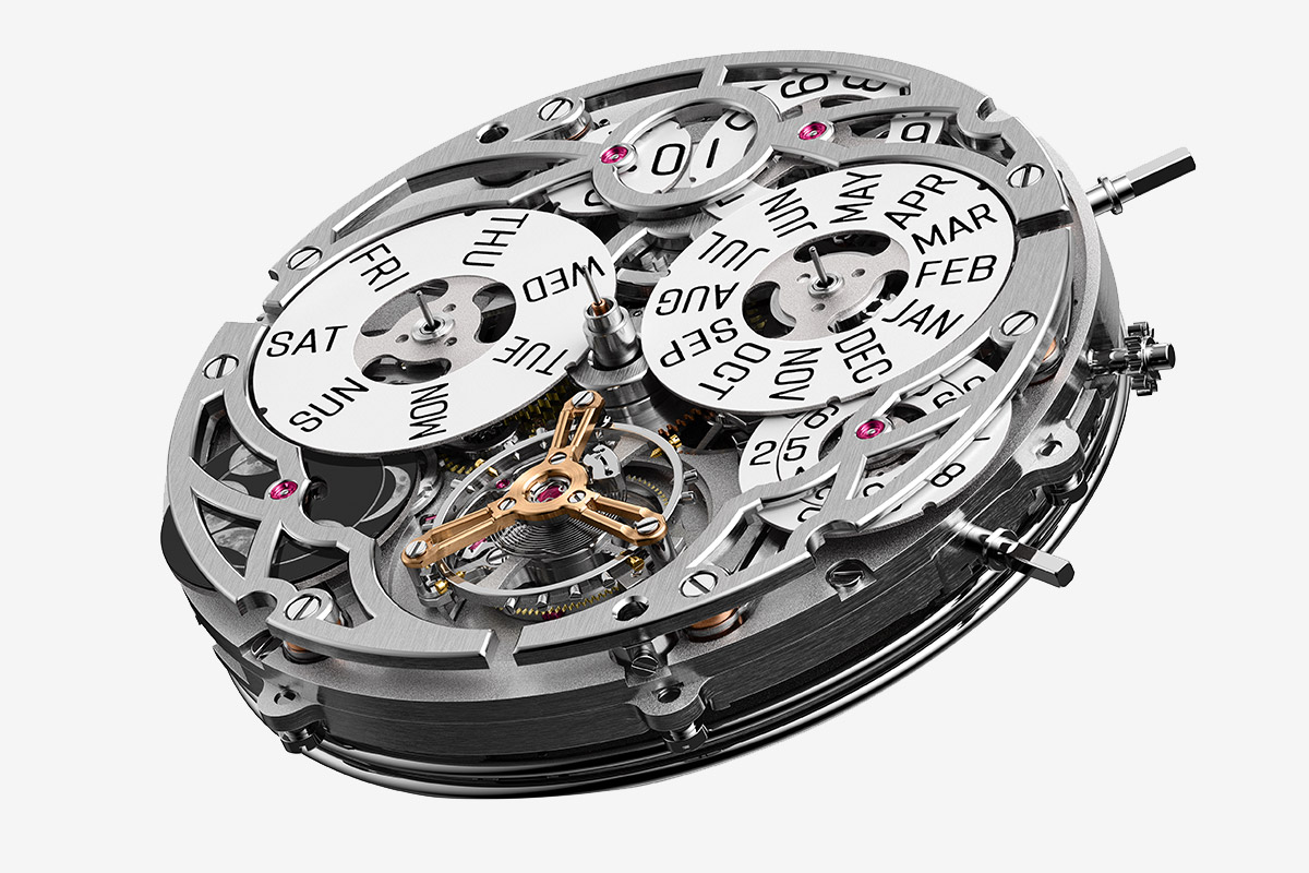 Deux correcteurs additionnels sont discrètement placés dans le fond de boîte, accessible grâce à un poussoir dédié à 6 heures. Alors que l’un ajuste le jour de la semaine, l’autre, marqué d’un croissant, corrige la lune astronomique. L’ouverture du fond révèle également la table d’harmonie en saphir de la Supersonnerie. Dévoilant le fonctionnement interne du mouvement, le fond secret s’ouvre à 180°, révélant également le cadran principal et le Calendrier Universel.