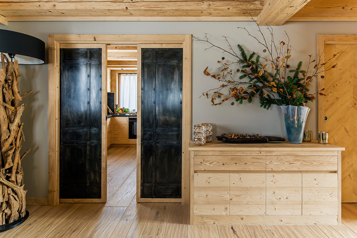 Dans la salle à manger, une double porte en fer vieilli mène à la cuisine, réalisée sur mesure, où Quarzite Nera, faisant partie de l’Exclusive Collection d’Antolini, en finition Lether, définit le plan de travail, un choix idéal pour un usage quotidien grâce à la nature intrinsèquement résistante de la quartzite.