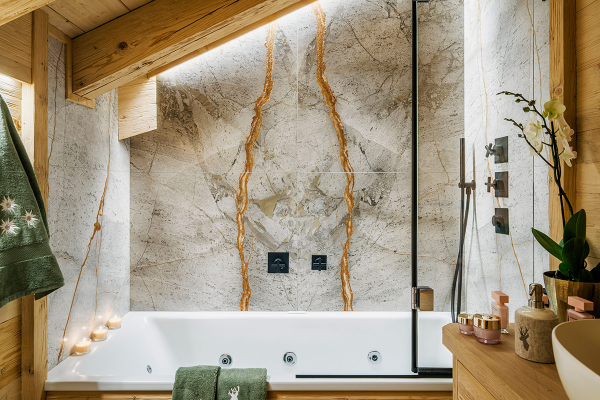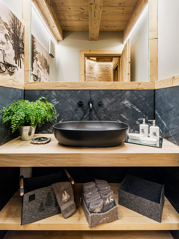À l’étage, dans les salles de bains, les pierres naturelles de chez Antolini contribuent à définir le caractère de l’espace privé. Grey Roots, marbre de la Natural Stone Collection proposé en finition Lether, accompagne le bois brossé avec une tonalité équilibrée, créant des surfaces douces au regard et agréables au toucher.