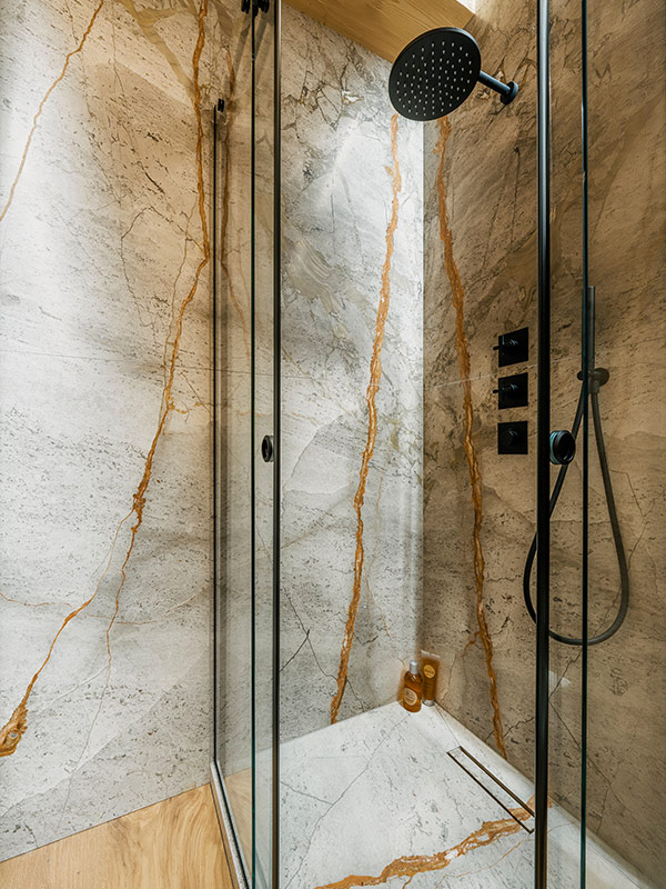 Dans les receveurs de douche, le traitement Hydro de la Textures+ Collection sculpte la pierre à travers des micro-irrégularités obtenues par des jets d’eau à haute pression, générant une texture dynamique qui amplifie les reflets de la lumière naturelle. Résultat : un équilibre entre esthétique et fonctionnalité, en cohérence avec l’approche sur mesure qui caractérise l’ensemble du projet.