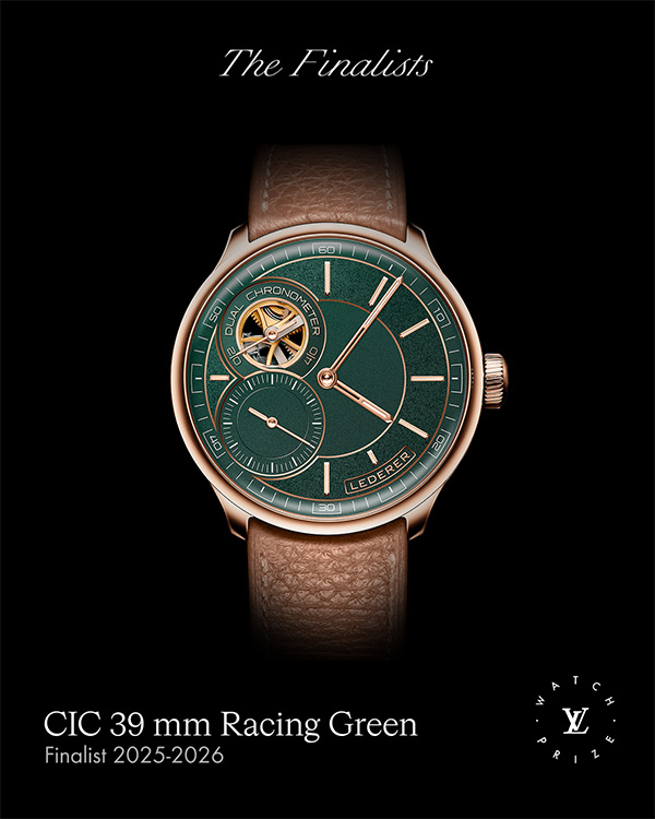 La Lederer CIC 39 Racing Green est dotée du premier double échappement à détente entièrement fonctionnel dans une montre-bracelet, avec un mouvement à deux échappements et deux remontoirs d’égalité assurant une transmission d’énergie en continu. Visible à travers un fond de boîtier transparent, le mouvement qui renferme 212 composants révèle un double engrenage ainsi que des mécanismes à force constante, tandis que son cadran mat sablé laisse entrevoir son échappement breveté et ses sous-cadrans en superposition avec secondes rétrogrades.