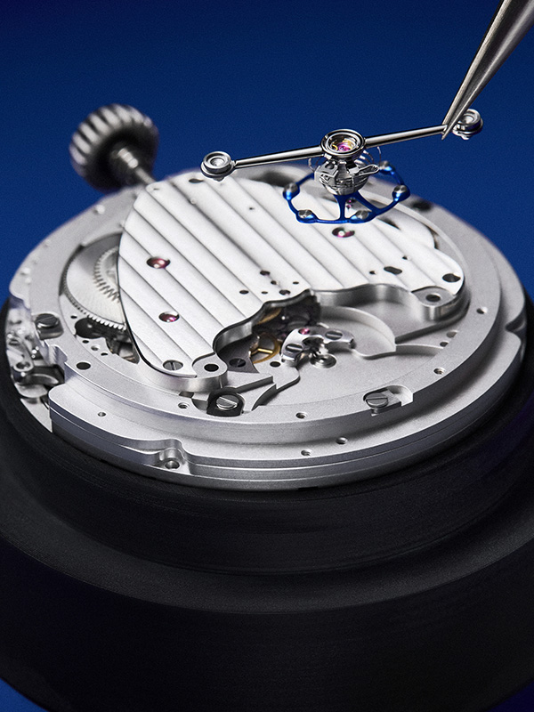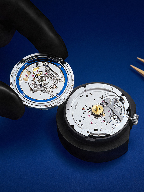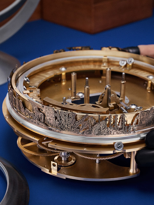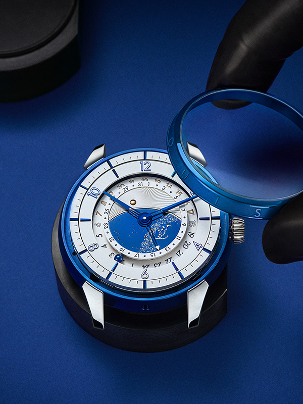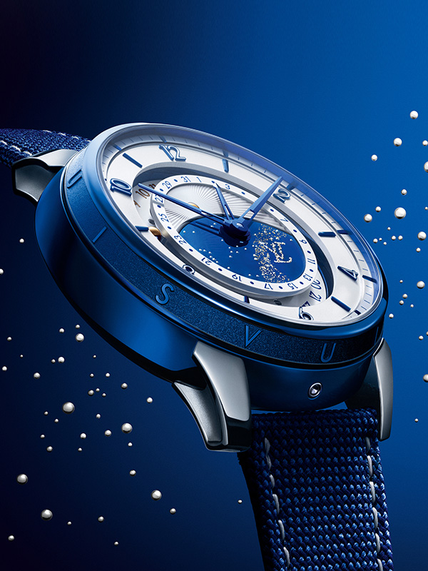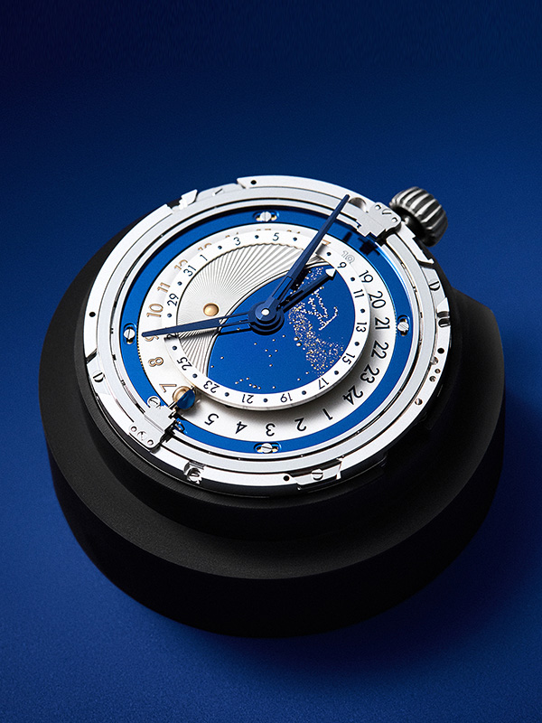 Autour du cadran, un indicateur sphérique jour/nuit effectue deux rotations complètes toutes les 24 heures, offrant une lecture continue et intuitive de l’heure sur le second fuseau horaire. Axée sur l’indication sphérique des phases de la Lune, la microsphère bicolore est composée d’or rose pour indiquer le jour et d’acier bleui à la flamme pour indiquer la nuit.