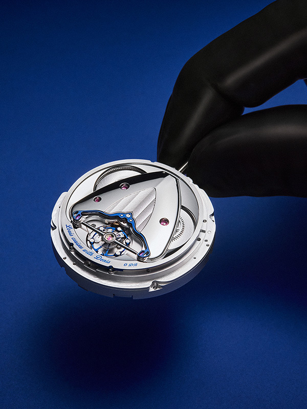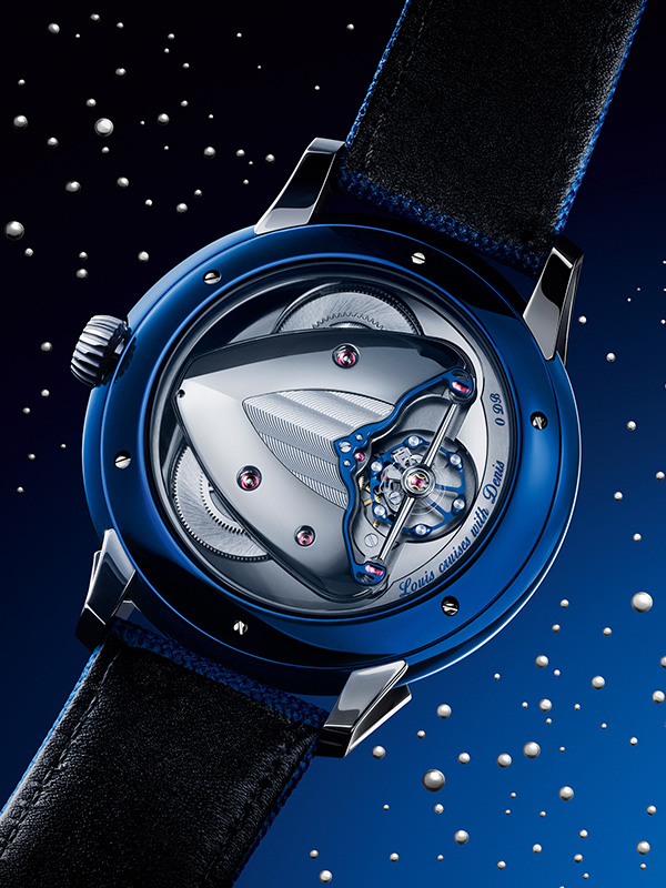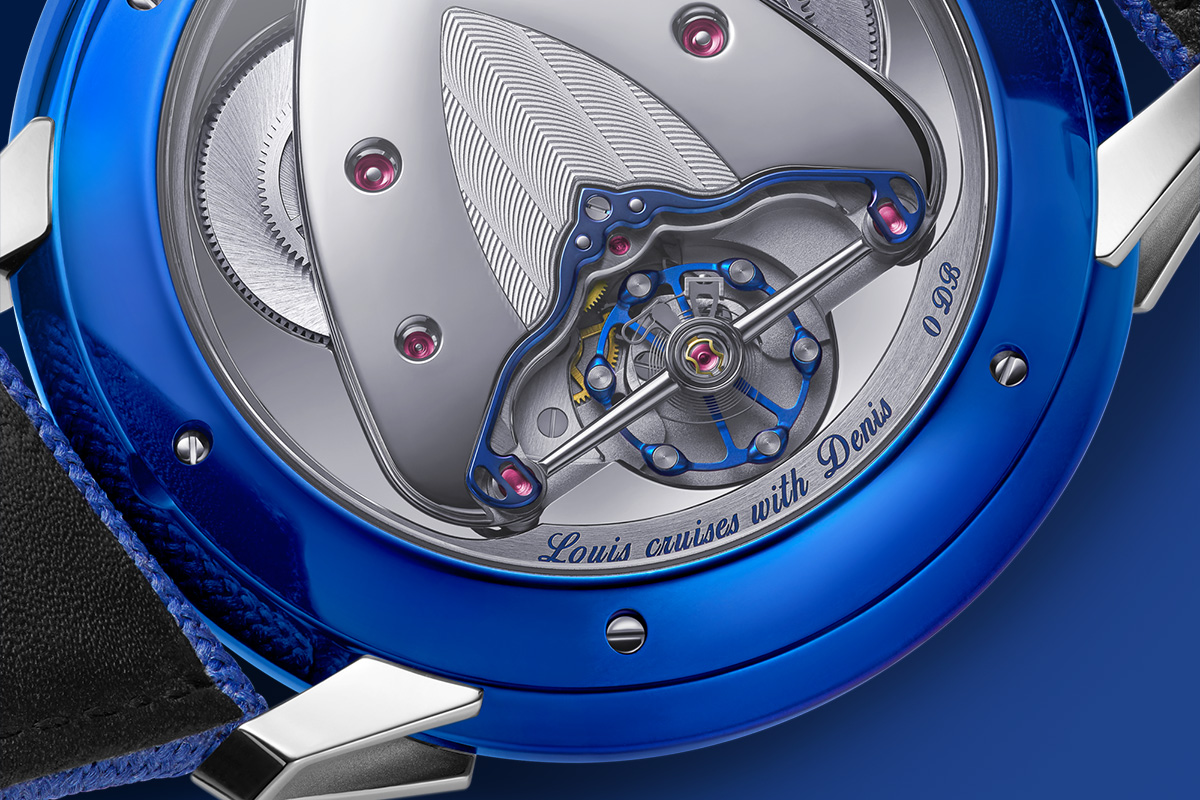 Le fond transparent de la montre révèle une vue imprenable sur le calibre DB2507LV. L’inscription « Louis cruises with Denis », élégant clin d’œil à la collaboration, est gravée sur le mouvement à côté du numéro de l’édition limitée, allant de « 01 sur 12 » à « 12 sur 12 ».