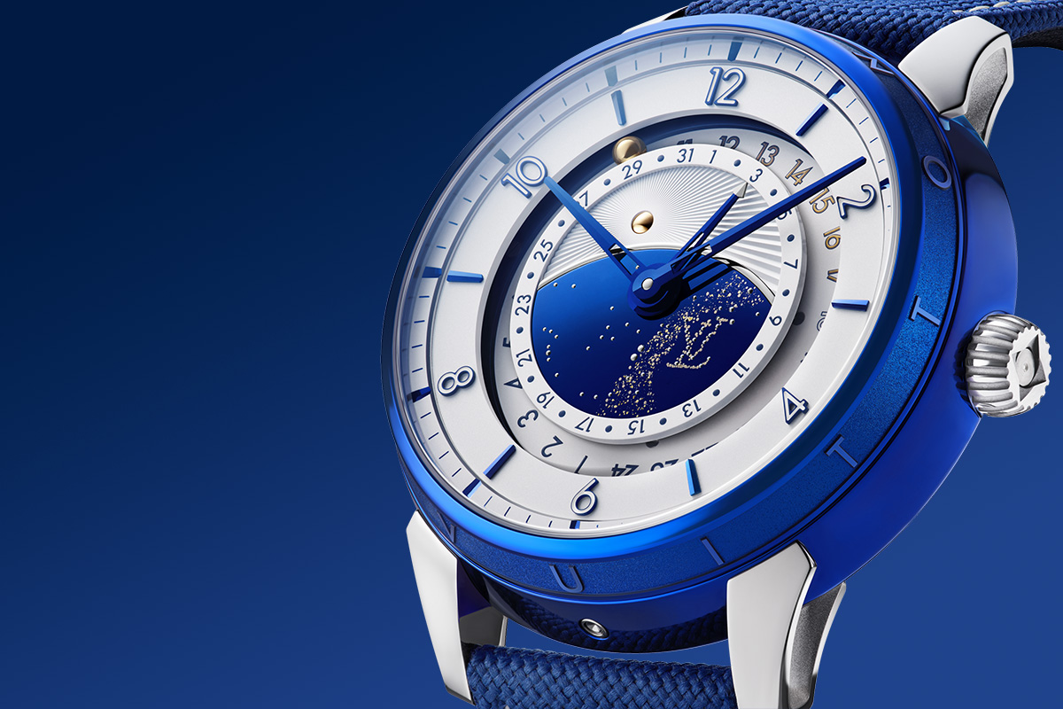 Les index polis et les chiffres Tambour rappellent les codes Louis Vuitton. La surface en opaline du cadran optimise la lisibilité et joue subtilement avec la lumière. Les aiguilles à facettes font écho aux tons bleu nuit du cadran et du boîtier.