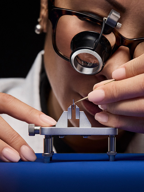 Les cornes en platine polies créent un contraste saisissant avec le titane bleui du boîtier. Leur éclat réhausse la profondeur de la couleur bleue, tout en magnifiant la forme architecturale de la montre. Chaque corne est polie à la main. L’intérieur microbillé au laser crée un contraste texturé discret, témoignage d’une attention méticuleuse portée au moindre détail, sous tous les angles.