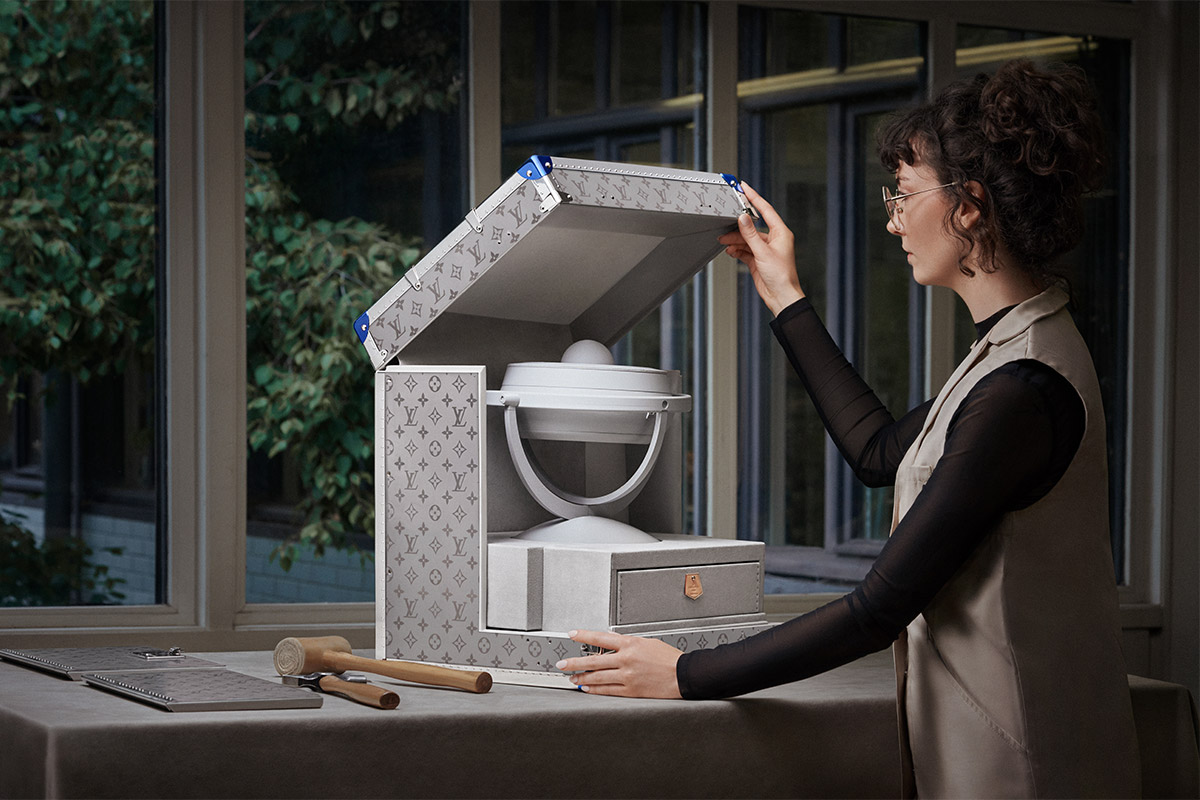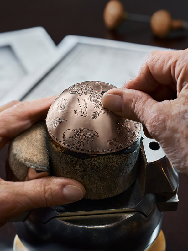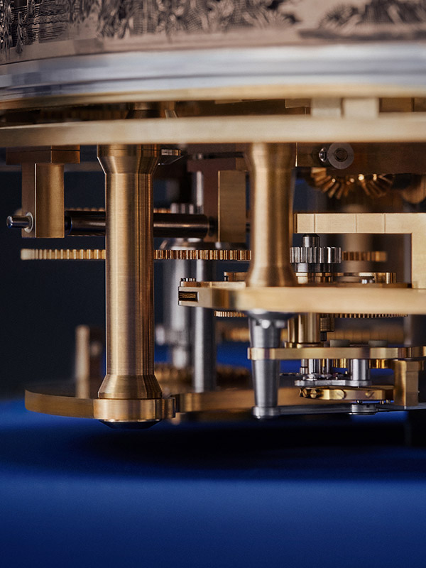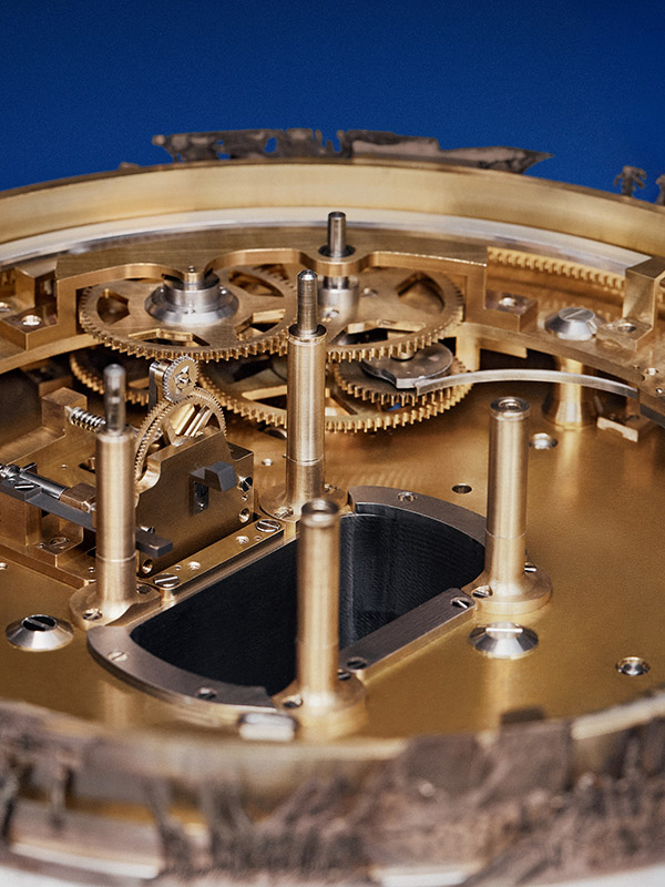 L’interface de synchronisation est discrètement dissimulée derrière un dôme gravé, situé sur la partie supérieure de la pendule. Réalisé en or rose, le dôme est orné de la constellation d’Hercule, référence subtile au signe astrologique du fondateur de Louis Vuitton. Une fois placée sur son berceau, la montre LVDB-03 GMT Louis Varius entre en résonance avec la pendule par l’intermédiaire de sa couronne. En 10 heures, le système remonte automatiquement la montre et toutes les deux heures, un mécanisme dédié, logé à l’arrière du garde-temps, recalibre son affichage pour le faire correspondre à la pendule, synchronisant ainsi les deux pièces.
