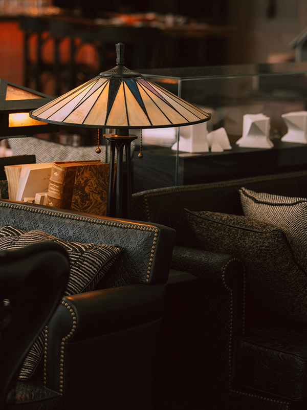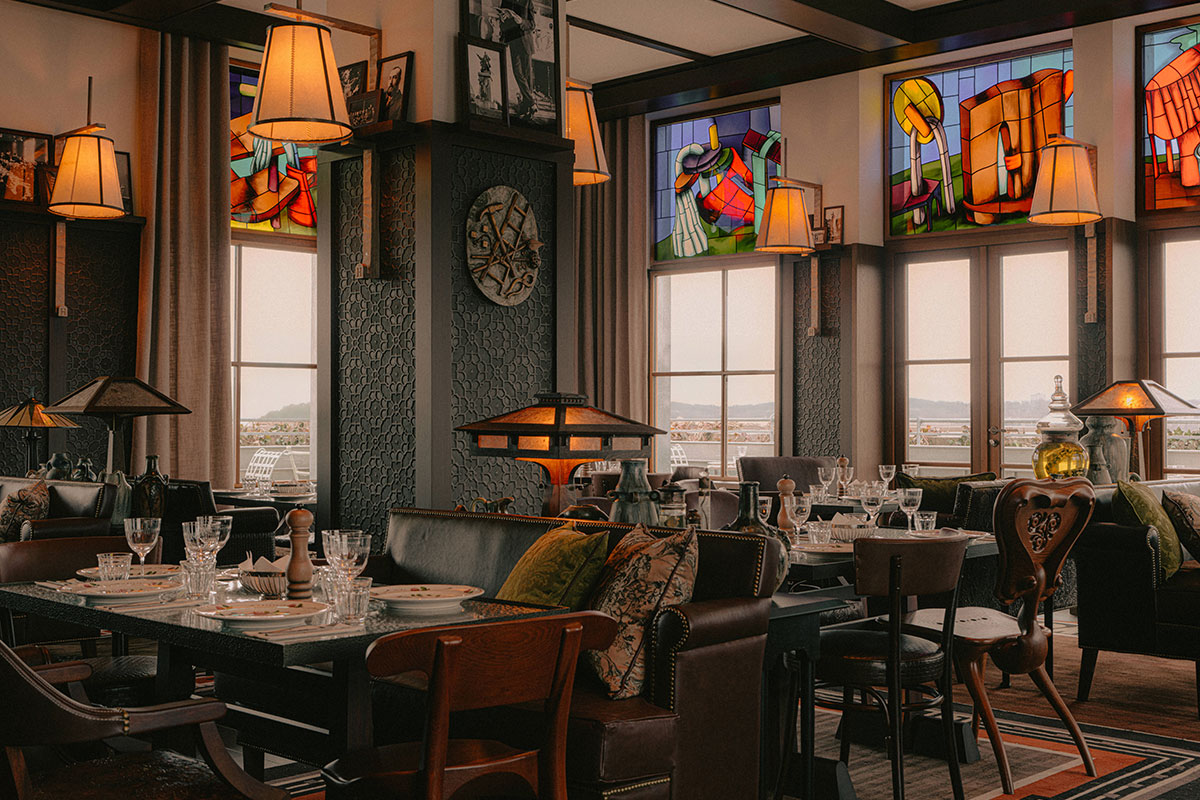 Perchée sur le toit et surplombant la ville à 360°, La Maison de Manfred est un lieu hors du temps. Depuis la terrasse et les jardins, on peut observer le fort historique de Queuleu, le Centre Pompidou, la Cathédrale Saint-Etienne… Sous les toits, elle accueille le décor d’une salle à manger à l’esprit familial, habillé d’un cabinet de curiosités, rare et inspirant. Partout, photos, souvenirs de l’histoire d’un lieu imaginaire qui a toujours existé. Pour cet espace unique, Ara Starck a créé dix-neuf vitraux, dont un monumental qui fait rayonner une lumière cathédrale colorée autant dans le salle principale du restaurant que sur la ville de Metz.