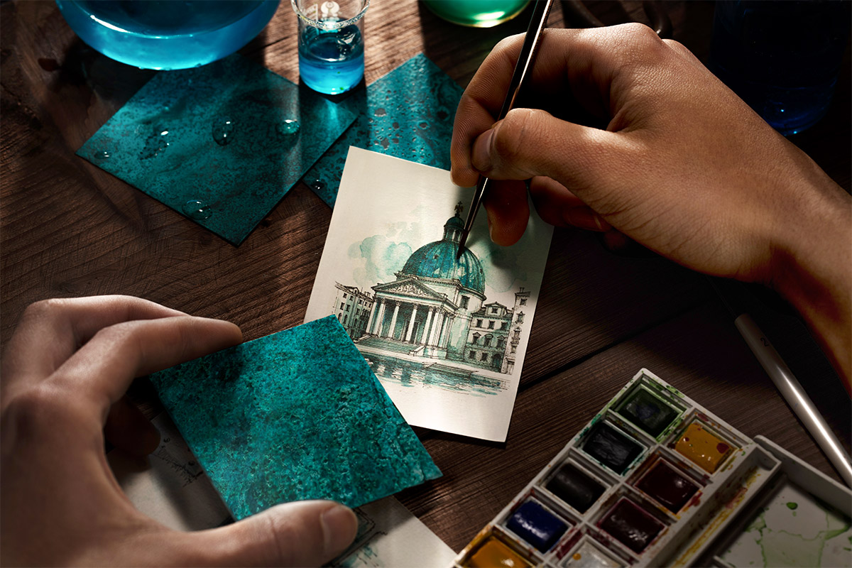 Venise se transforme jour après jour, dans le silence du temps. Les eaux de la lagune, l’air salin et l’humidité façonnent les métaux de ses architectures, transformant au fil des années le cuivre et le laiton en surfaces vivantes, traversées de fascinantes nuances de vert et de turquoise. Une métamorphose silencieuses mais constante, où le temps n’efface pas mais évolue vers de nouvelles formes de beauté.