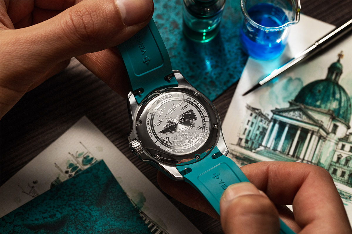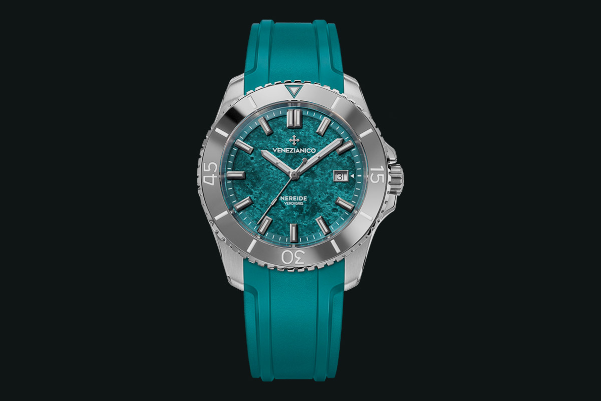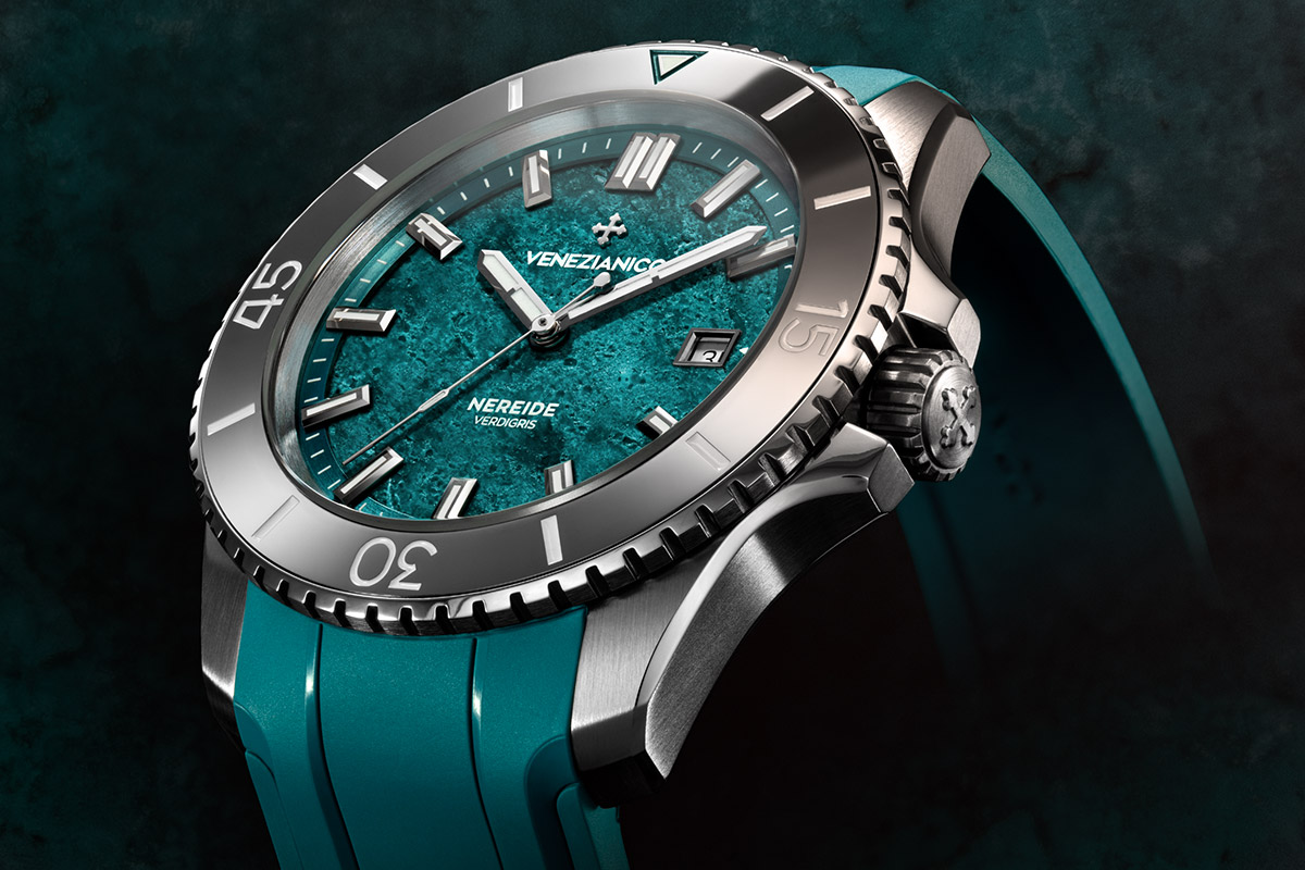 De cette observation naît Nereide Verdigris, une nouvelle interprétation de la montre de plongée qui transfère sur le cadran le charme de ces métaux vénitiens.