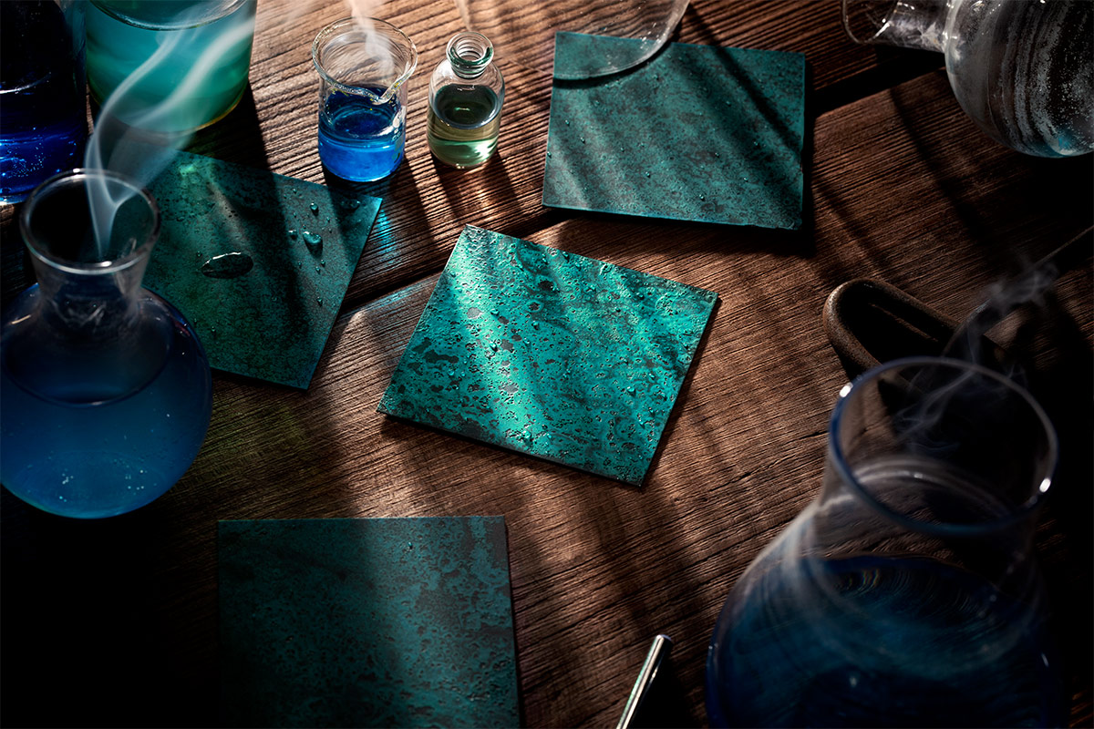 Un processus artisanal soigneusement étudié commence à partir d’une base en laiton, matériau choisi pour sa capacité à réagir aux agents oxydants et à développer des patines profondes et complexes. Grâce à une technique d’oxydation contrôlée, combinée à des phases spécifiques de traitement, le métal développe progressivement la patine vert-de-gris caractéristique, une coloration entre vert, turquoise et bleu.